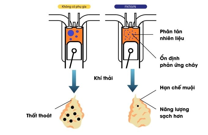 FNT6VN có khả năng tác động đồng thời lên nhiều khía cạnh của quá trình cháy. Trước hết, các hợp chất trong phụ gia giúp nhiên liệu phân tán tốt hơn, làm tăng diện tích tiếp xúc với không khí, từ đó giúp phản ứng cháy diễn ra nhanh và triệt để hơn.