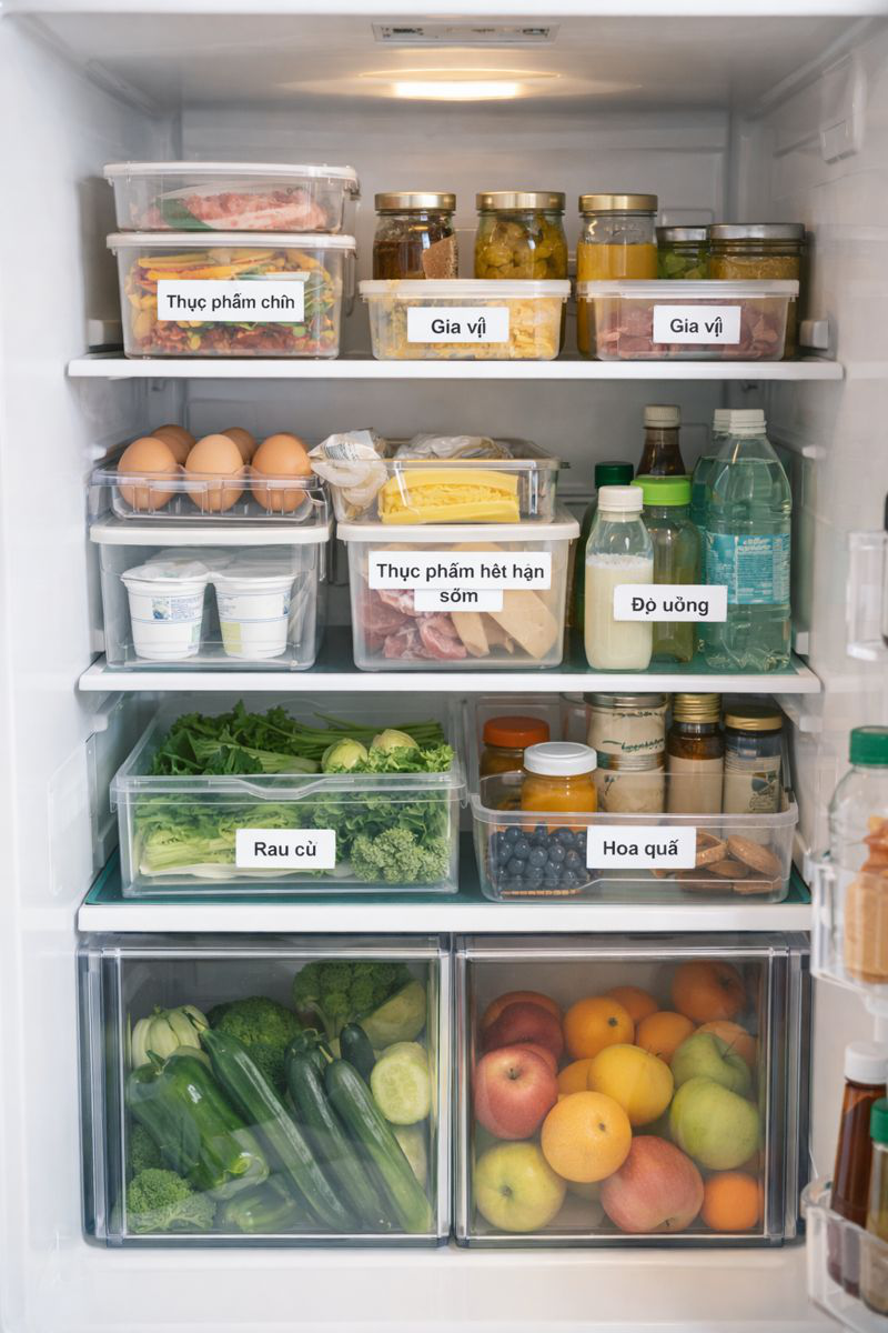 Với thực phẩm: đồ sắp hết hạn để phía trước; sống – chín tách riêng (chín ở trên, sống ở dưới), thịt sống đóng kín.