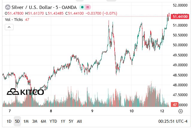 Giá bạc giao ngay ngày 13/10 đạt trên 51,5 USD/ounce. Trong khi đó, giá hợp đồng tương lai bạc trên sàn Comex dao động quanh mức 49,5 USD. Tại Việt Nam, bạc Phú Quý đang được giao dịch với mức giá 54,3 triệu đồng/kg bán ra, 52,6 triệu đồng/kg mua vào.