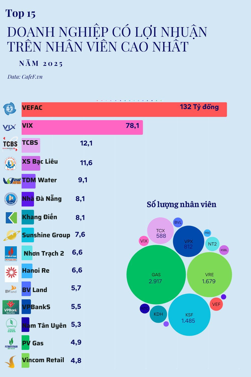 Dẫn đầu bảng xếp hạng năm 2025 là VEFAC (mã VEF), công ty con của Vingroup. Với mức lợi nhuận trước thuế tăng đột biến 1.526% lên 19.270 tỷ đồng, VEFAC đạt mức lợi nhuận trên mỗi nhân viên lên tới 132 tỷ đồng/người. Cuối năm 2025, VEFAC chỉ có 146 nhân sự (tăng 72 người so với năm trước).
