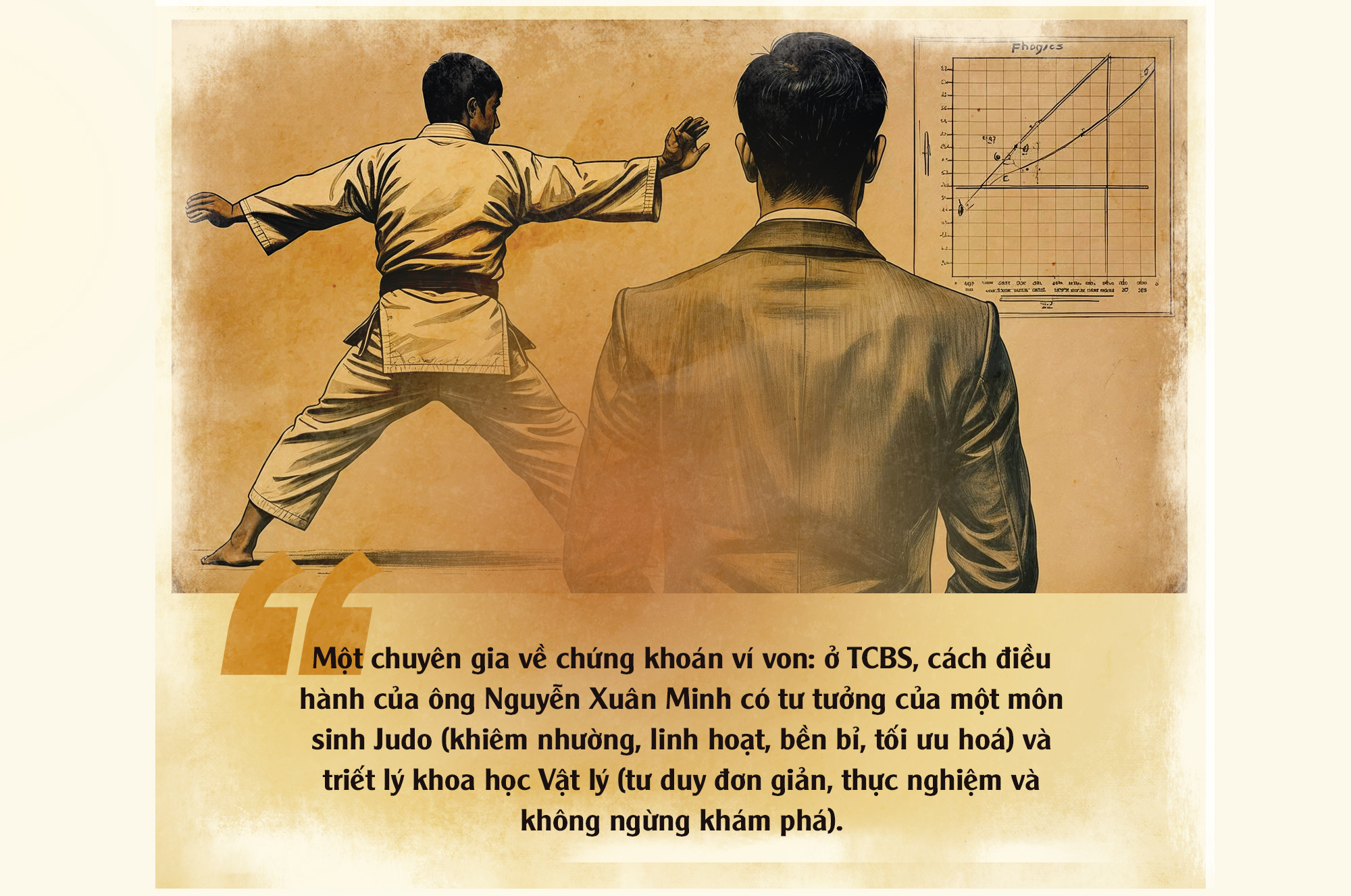 Một chuyên gia về chứng khoán ví von: ở TCBS, cách điều hành của ông Nguyễn Xuân Minh có tư tưởng của một môn sinh Judo (khiêm nhường, linh hoạt, bền bỉ và tối ưu hoá) và triết lý khoa học Vật lý (tư duy đơn giản, thực nghiệm và không ngừng khám phá). Sở dĩ có hình ảnh đó bởi ông Nguyễn Xuân Minh từng đoạt Huy chương Vàng Judo và giải Nhất Vật lý toàn thành phố (Hồ Chí Minh) khi còn học phổ thông. Chủ tịch TCBS gọi đó là “những ngày Vàng” của mình.