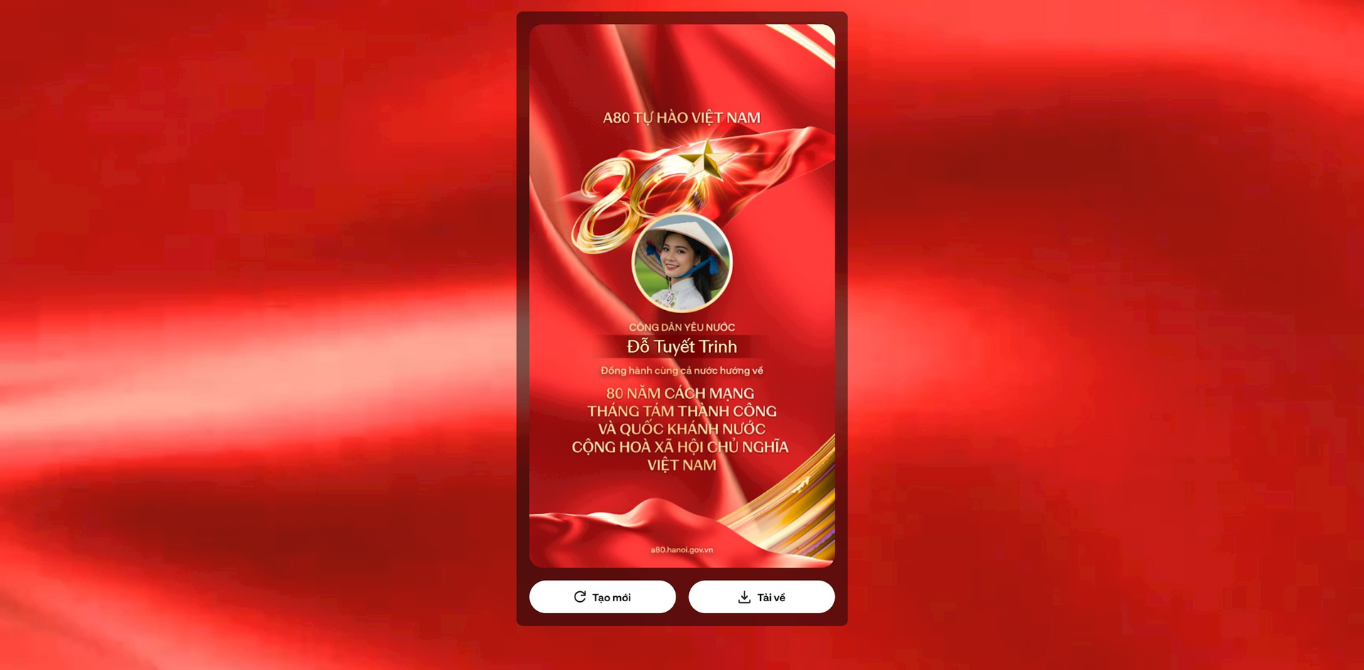 Đây là tính năng tạo ảnh đại diện và tạo thiệp mời trên nền tảng số “A80 - Tự hào Việt Nam”. Hãy cùng nhau lan tỏa tinh thần tự hào, niềm tri ân trước thềm ngày lễ lớn của dân tộc.
