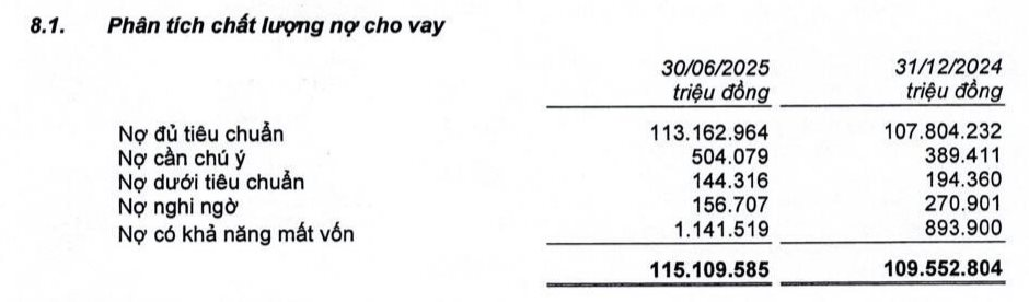 Dư nợ cho vay khách hàng đạt 115.109 tỷ đồng, tăng 5% so với đầu kỳ, phản ánh định hướng tăng trưởng tín dụng thận trọng. Song song đó, tiền gửi khách hàng cũng tăng 7%, đạt 125.120 tỷ đồng, giúp duy trì được thanh khoản ổn định và đảm bảo nguồn vốn cho vay.