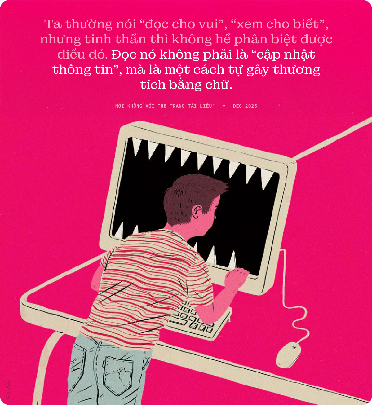 Không đọc, nghĩa là chặn từ gốc cái cơn tò mò yếu đuối kiểu “cho xem một chút thôi mà”, “không xem thì thấy lạc đề với thiên hạ”. Bấm vào file, tải về rồi tự tra tấn đầu óc mình bằng từng chi tiết rùng rợn không phải là “cập nhật thông tin”, mà là tự ký giấy cho bạo lực tinh thần vào nhà.
