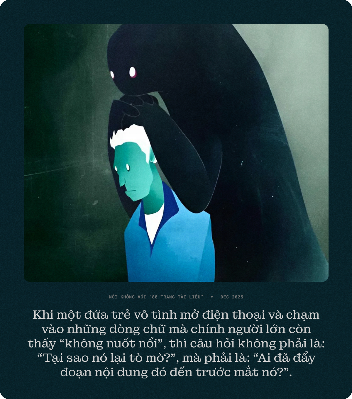 Câu trả lời, rất tiếc, nhiều khi chính là chúng ta - những người lớn tự cho mình quyền “đọc cho biết”, “share cho nóng”, nhưng lại quên mất rằng mình đang sống chung một newsfeed với những bộ não còn đang trong giai đoạn trong sáng và dễ tổn thương. Người lớn có thể tự trấn an bản thân và vững vàng vượt qua những cảm giác tồi tệ nhiều ngày sau đó. Nhưng bọn trẻ thì không dễ như vậy. Chúng có thể phải trả giá bằng những nỗi sợ không gọi tên nổi, bằng những đêm mất ngủ, bằng một niềm tin lặng lẽ bị bẻ cong trong đầu - chỉ vì đâu đó, người lớn đã nghĩ: “Đọc cho biết thôi mà, có gì đâu.”