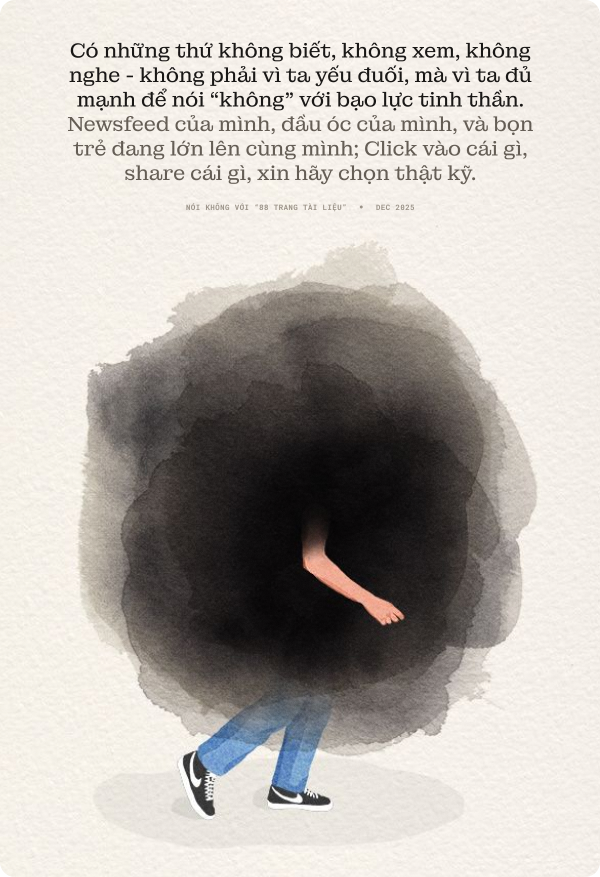 Còn mỗi cá nhân dùng mạng, từ người bình thường đến người có sức ảnh hưởng, đều phải coi việc không đọc, không share những nội dung như vậy là một dạng trách nhiệm xã hội cơ bản, nhất là khi ta biết mình đang online chung không gian với rất nhiều đứa trẻ. Ở thời đại này, bảo vệ bản thân không chỉ là đeo khẩu trang ngoài đường, mà còn là học cách đeo “khẩu trang” cho tâm trí: chọn kỹ thứ mình cho vào đầu. Có những thứ không biết, không xem, không nghe - không phải vì ta yếu đuối, mà vì ta đủ mạnh để nói “không” với bạo lực tinh thần.