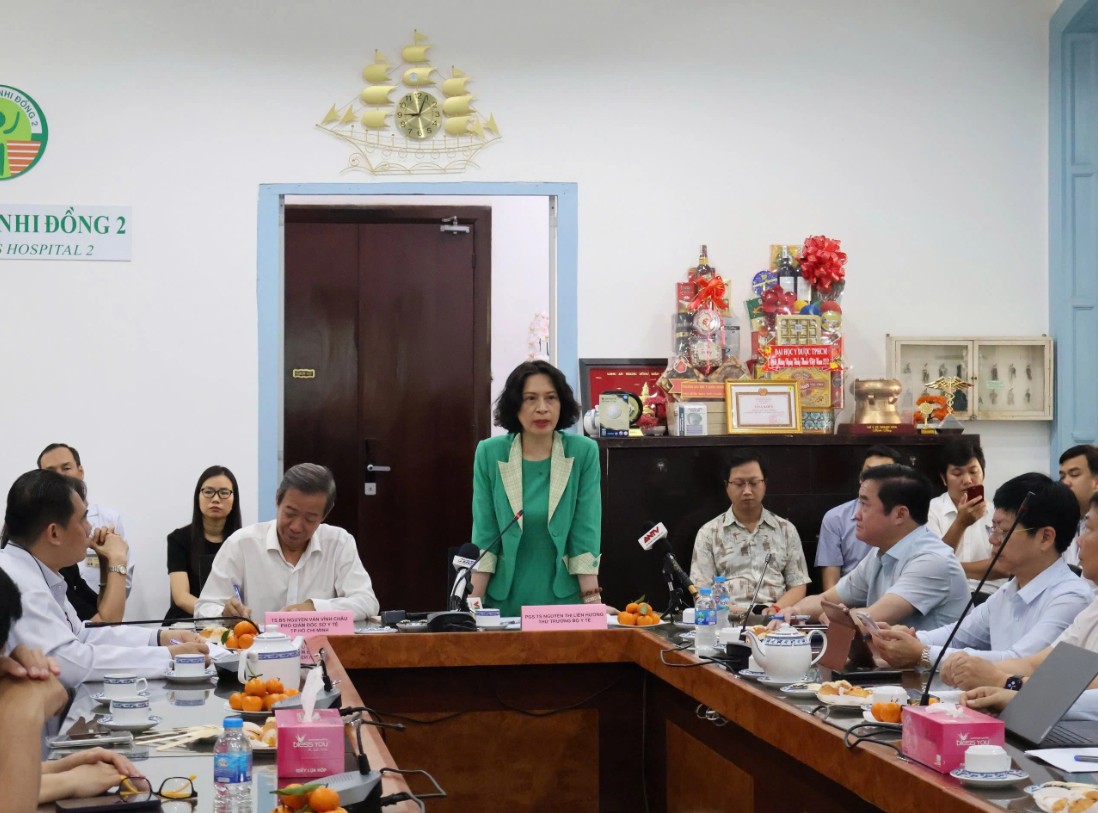 Đoàn công tác do Thứ trưởng Bộ Y tế Nguyễn Thị Liên Hương làm trưởng đoàn kiểm tra công tác phòng, chống dịch bệnh tay chân miệng tại Bệnh viện Nhi đồng 2 - Ảnh: Báo Thanh Niên
