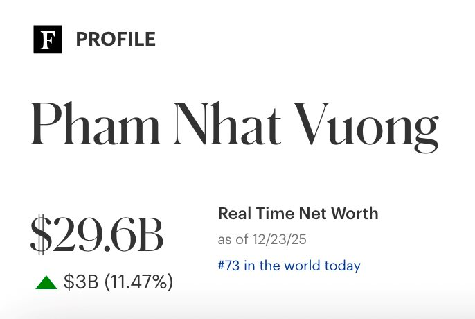 Cổ phiếu VIC bốc đầu đẩy tài sản của tỷ phú Phạm Nhật Vượng tăng chóng mặt. Theo cập nhật của Forbes tại ngày 23/12, người giàu nhất Việt Nam có khối tài sản lên đến 29,6 tỷ USD, đứng thứ 73 trong danh sách các tỷ phú thế giới. Con số này gần bằng với khối tài sản của tỷ phú Jack Ma, theo tính toán của Forbes.