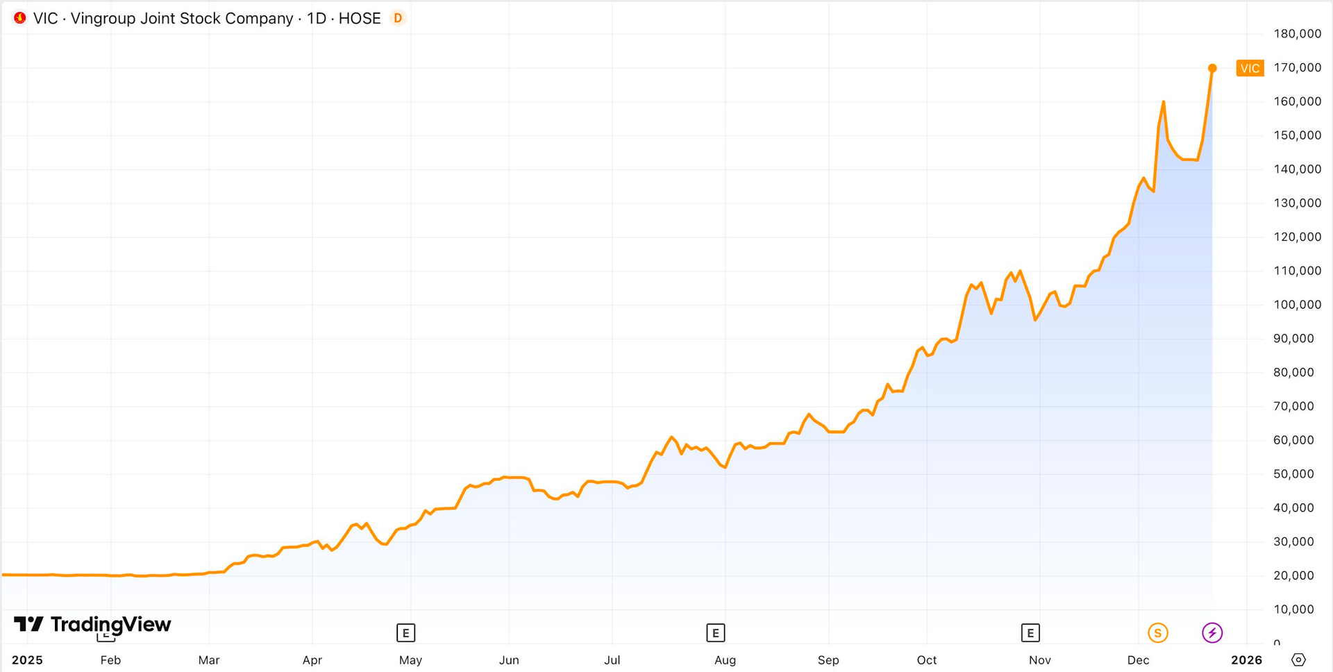 Trên sàn chứng khoán, cổ phiếu VIC đang có nhịp tăng mạnh với 2 phiên trần liên tiếp qua đó leo lên mức 169.900 đồng/cp, cao nhất kể từ khi niêm yết tính theo giá điều chỉnh. Vốn hóa thị trường của Vingroup cũng theo đó lập kỷ lục 1,3 triệu tỷ đồng, con số vô tiền khoáng hậu trong lịch sử chứng khoán Việt Nam.