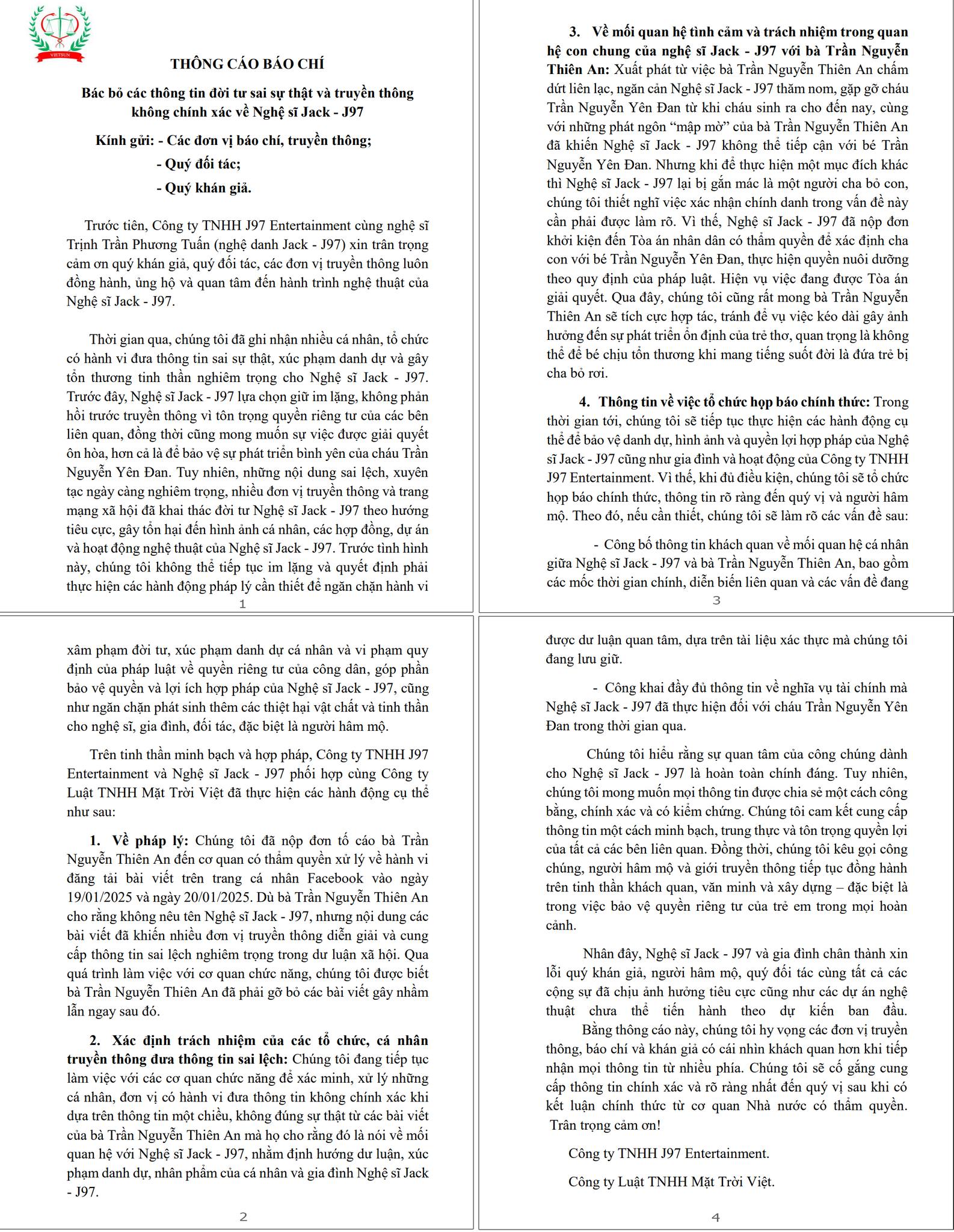 "Dù bà Trần Nguyễn Thiên An cho rằng không nêu tên Nghệ sĩ Jack - J97, nhưng nội dung các bài viết đã khiến nhiều đơn vị truyền thông diễn giải và cung cấp thông tin sai lệch nghiêm trọng trong dư luận xả hội. Qua quá trình làm việc với cơ quan chức năng, chúng tôi được biết bà Trần Nguyễn Thiên An đã phải gỡ bỏ các bài viết gây nhầm lẫn ngay sau đó", phía Jack thông tin.