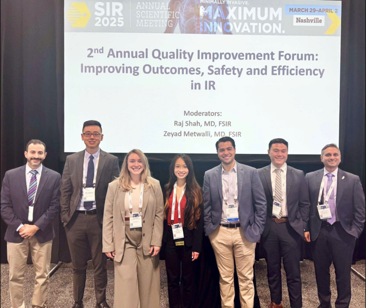 Mai Chi (giữa) trình bày nghiên cứu tại hội thảo khoa học năm 2025, Hội Can thiệp hình ảnh quốc tế.