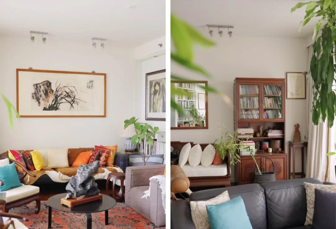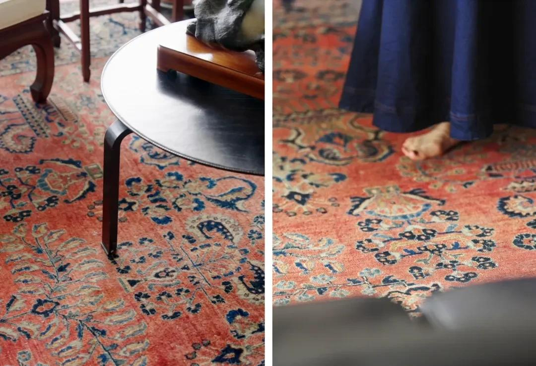 Trong phòng khách, đồ Trung – Tây hòa trộn. Ghế sofa là của Cassina - thương hiệu Ý nổi tiếng với việc sản xuất lại những thiết kế kinh điển của các kiến trúc sư thế kỷ 20. Chiếc ghế nằm của Le Corbusier, bà mua từ năm 1993, đến giờ hơn 30 năm vẫn dùng mỗi ngày, nằm đó nhìn ra khung cửa sổ Bắc Kinh. Dưới chân là tấm thảm Ba Tư đã hơn trăm tuổi, đồ gia truyền nhà bà, sờ vào là biết qua tay bao nhiêu thế hệ.