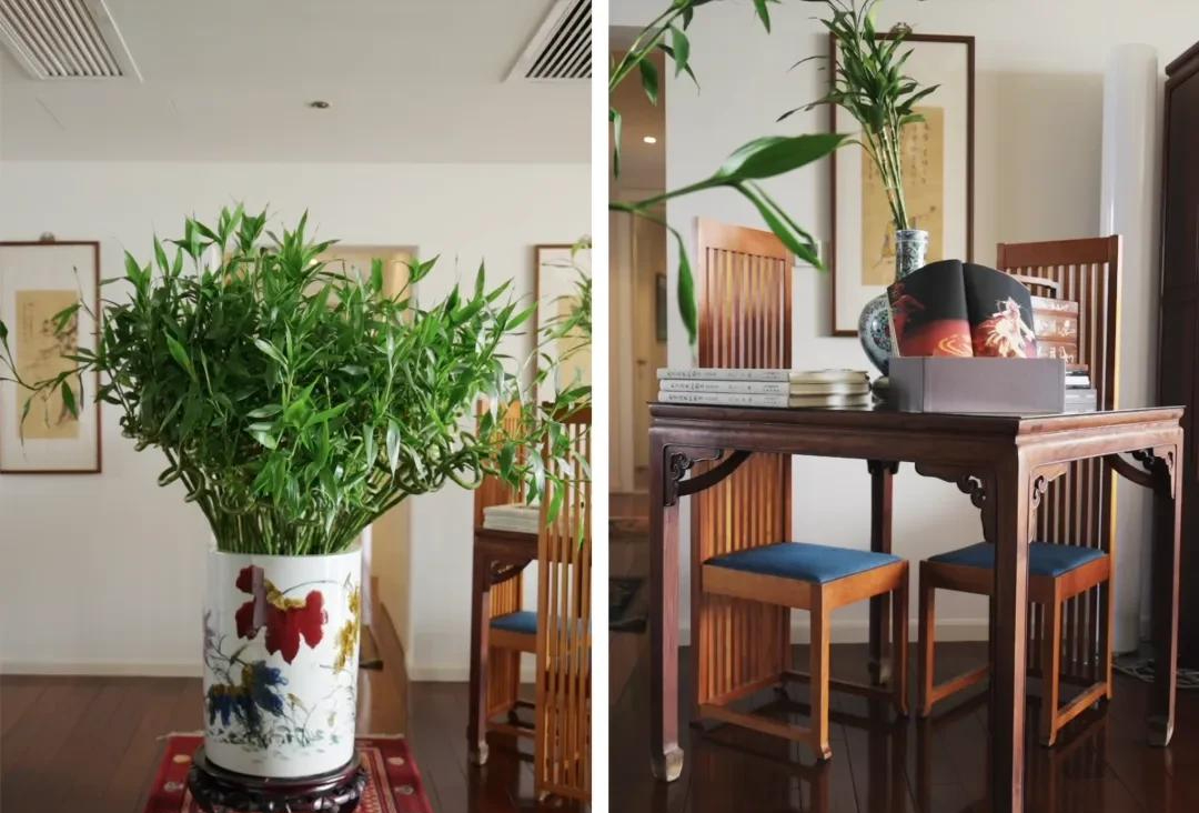 Bước vào cửa, khách đã thấy một chậu trúc lớn đặt ở sảnh vừa che bớt tầm nhìn, tạo sự riêng tư, vừa đúng gu của chủ nhà: “Tôi thích cái cốt cách của cây trúc, nhìn vào là thấy nhẹ người". Ngay lối vào là chiếc bàn gỗ hoàng hoa lê (gỗ sưa) đầu tiên bà mua. Bà biết nó đã bị sửa chữa nhiều, không hoàn hảo, nhưng vẫn giữ lại như một “bài học đầu đời”: Muốn mua đồ cổ, phải chịu khó tìm hiểu, không được nông nổi.