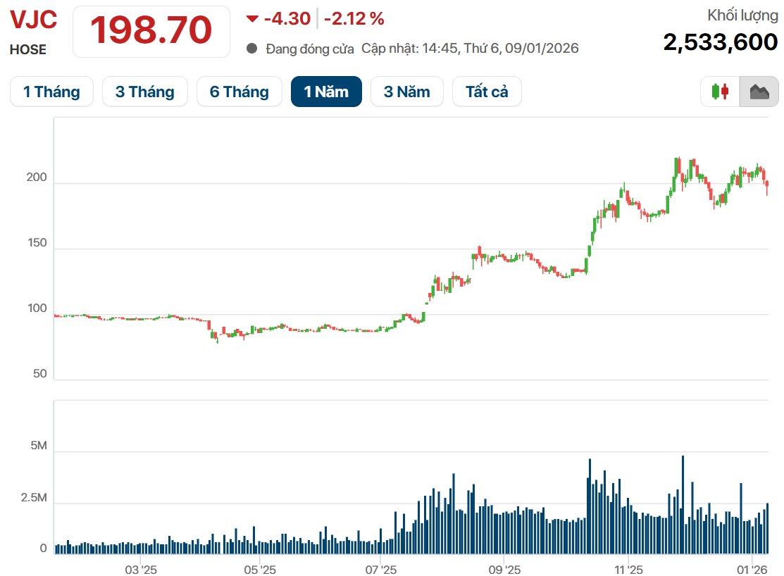 Trong năm 2025, giá cổ phiếu VJC đã tăng 109% và giá cổ phiếu HDB đã tăng 51%.