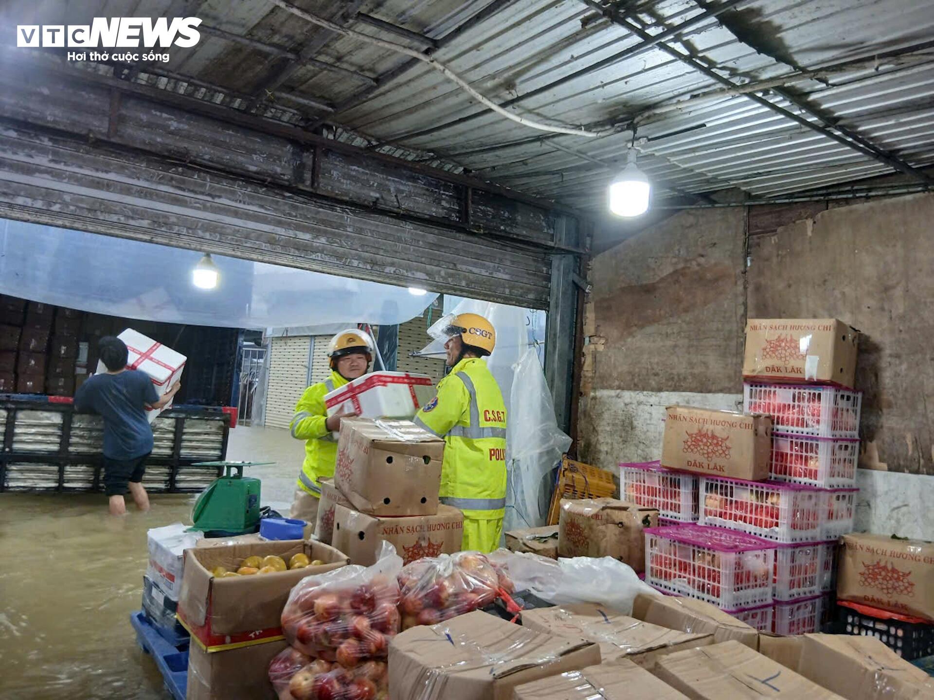 Quá trình làm nhiệm vụ, phát hiện gian hàng trái cây tại khu chợ Đông Ba bị ngập sâu trong nước, lực lượng CSGT Công an TP Huế lập tức xuống hỗ trợ tiểu thương đưa các thùng hoa quả lên ô tô, đưa đến nơi an toàn.