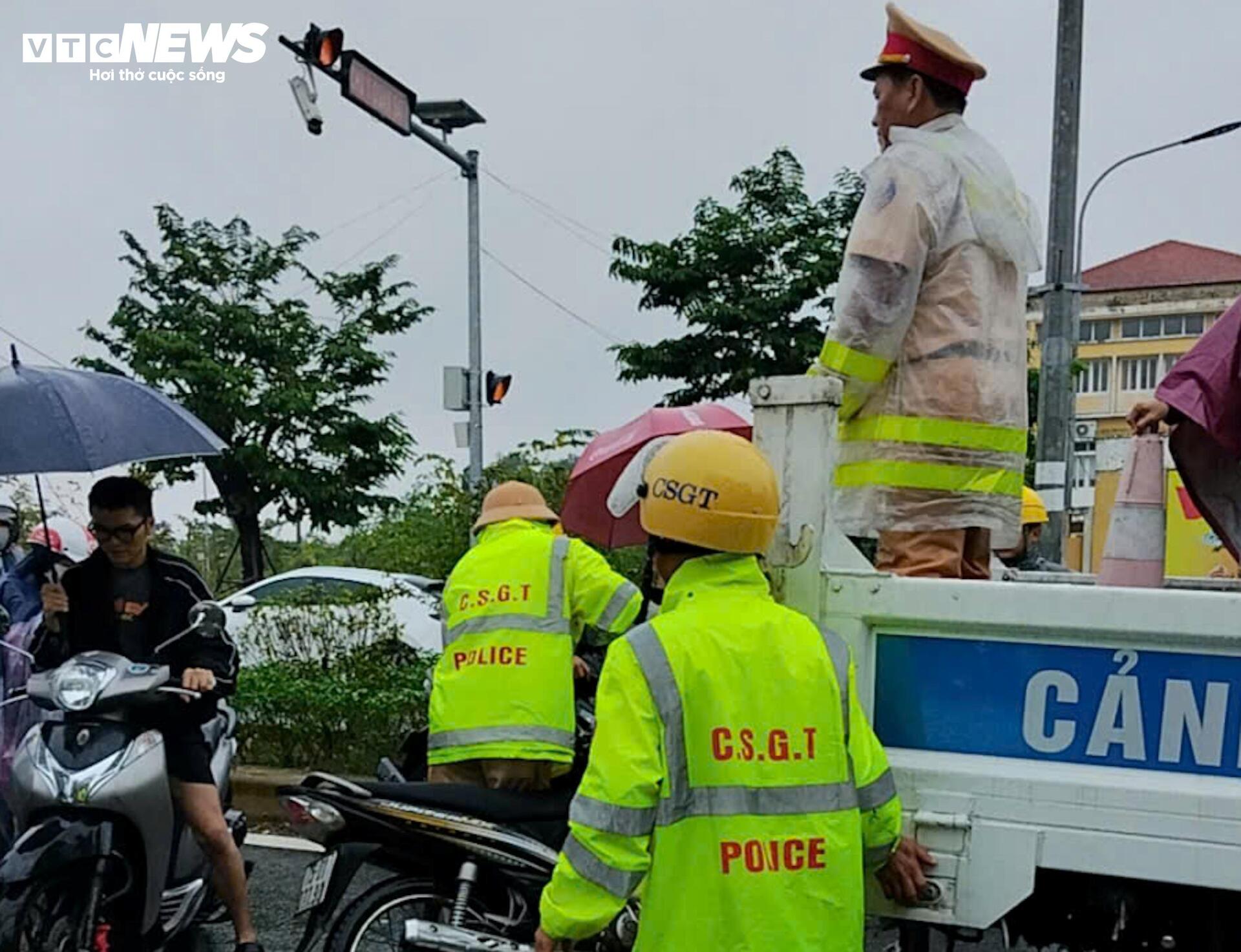 Tại các tuyến đường, lực lượng CSGT Công an TP Huế bố trí các tổ ứng trực, sử dụng xe chuyên dụng giúp dân vượt qua khu vực ngập sâu.