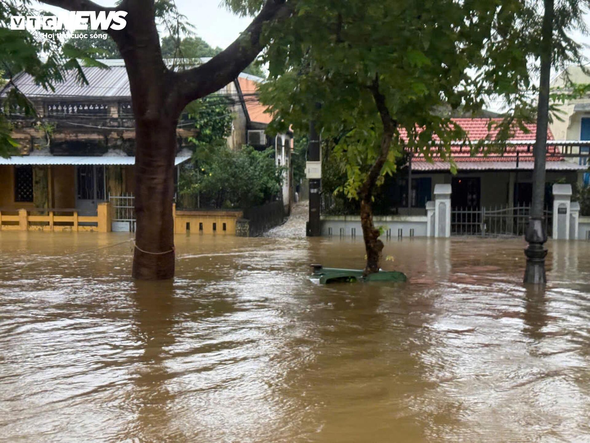 Nước sông Hương dâng cao, lượng nước đo được lúc 12h20 ngày 27/10 là 4,26 mét (trên báo động 3 và vượt đỉnh lũ năm 2020 - năm xảy ra sự cố sạt lở tại thuỷ điện Rào Trăng 3); trên sông Bồ là 4,77 mét (mức báo động 3 là 4,5 mét). Nước sông dâng khiến nhiều nơi vùng hạ du, đô thị trung tâm TP Huế chìm trong biển nước. Trong hình là tuyến đường ở phường Phú Xuân (TP Huế) nước lên gần nửa nhà dân.