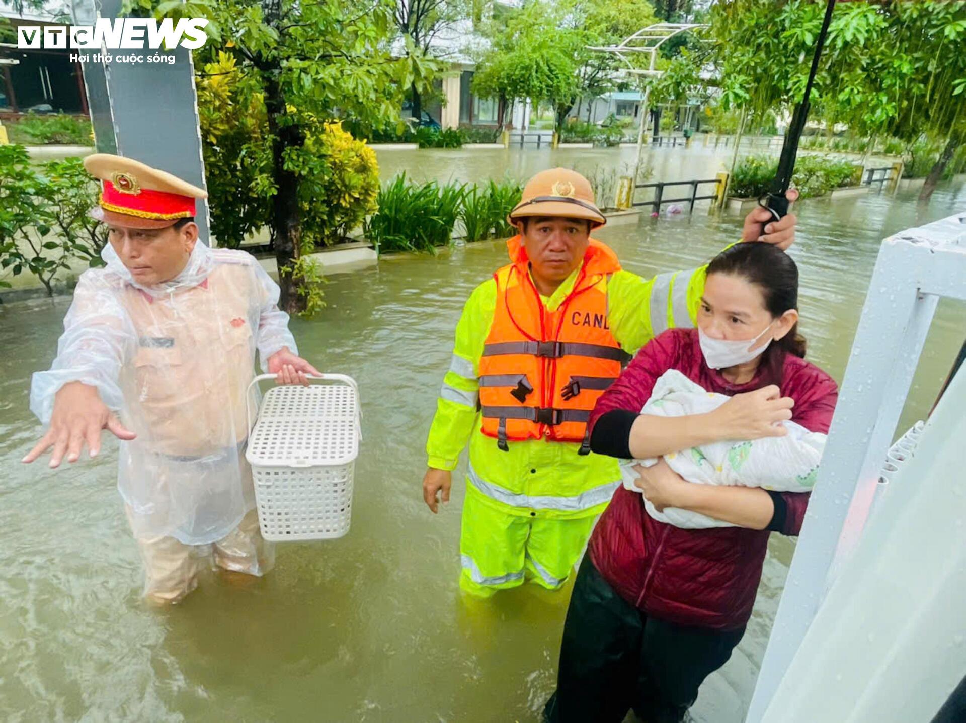 Một sản phụ ở phường An Đông (TP Huế) có nhà ngập sâu gần 0,8 mét, không có thuyền, ghe di chuyển được các cán bộ, chiến sĩ Đội CSGT Số 2 (Phòng CSGT Công an TP Huế) kịp thời đến hỗ trợ, đưa 2 mẹ con sản phụ đến nơi an toàn.