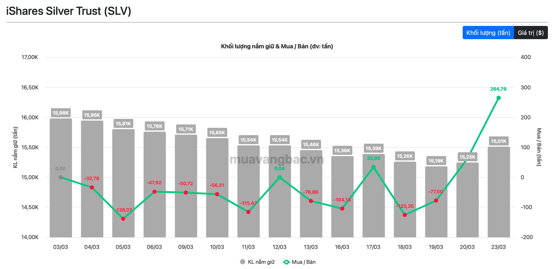 Theo dữ liệu cập nhật mới nhất từ Muavangbac.vn, quỹ bạc lớn nhất thế giới iShare Silver Trust (SLV) đã tung 570 triệu USD để mua gần 265 tấn bạc trong ngày 23/3. Đây là khối lượng mua ròng lớn nhất của quỹ trong nhiều tháng trở lại đây. Kết quả này đẩy tổng lượng bạc do SLV nắm giữ trở lại mức trên 15.500 tấn.