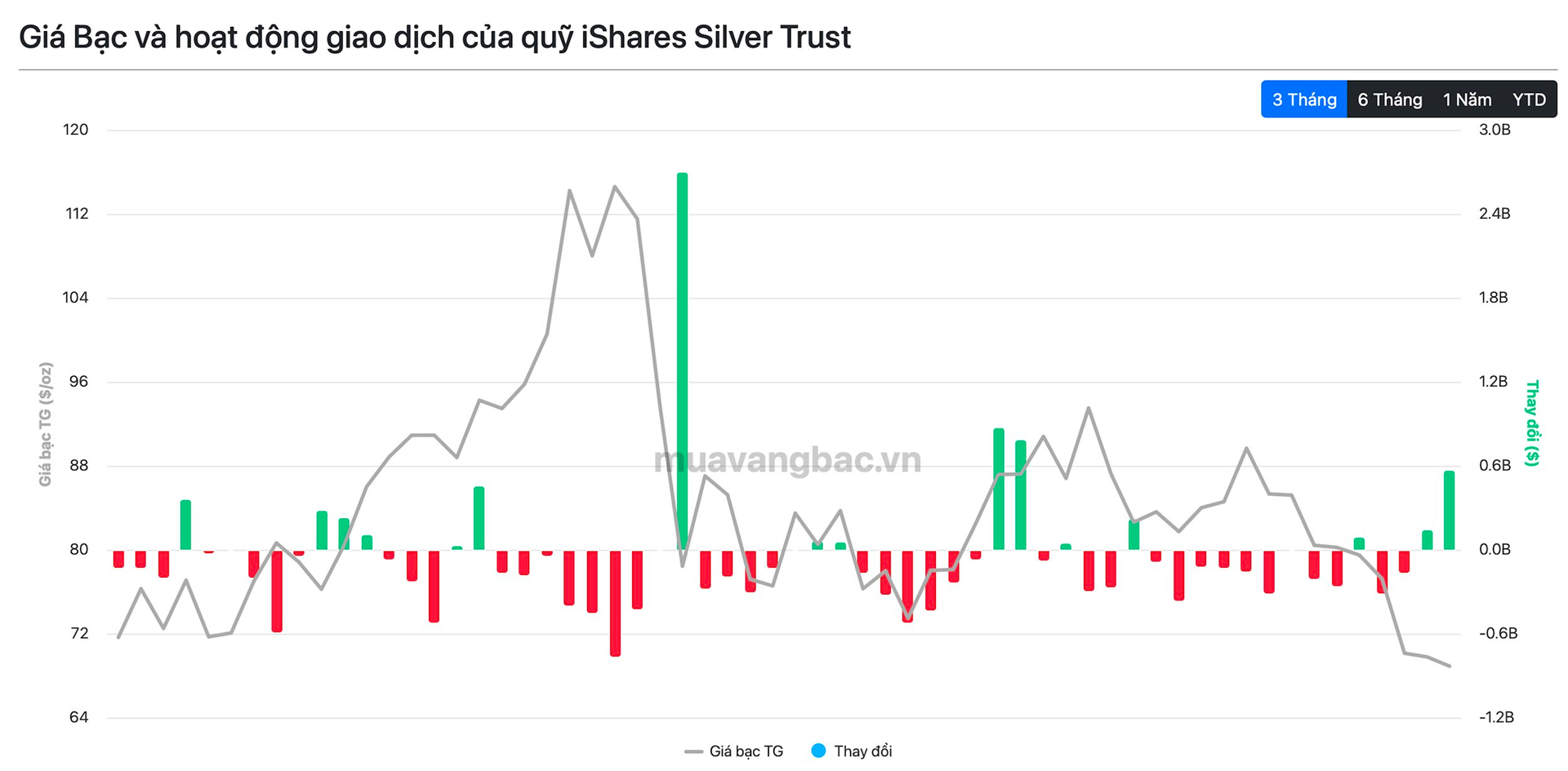 Trong 2 ngày gần nhất, SLV đã mua vào tổng cộng hơn 300 tấn bạc. Động thái diễn ra trong bối cảnh giá bạc rơi sâu, thậm chí có thời điểm xuống sát 60 USD/oz trong ngày 23/3, tức là chia đôi kể từ mức cao nhất từng chạm đến hồi cuối tháng 1 năm nay. Việc giá bạc giảm sốc đã kích thích dòng tiền bắt đáy đổ về các quỹ ETF bạc, đặc biệt là SLV.
