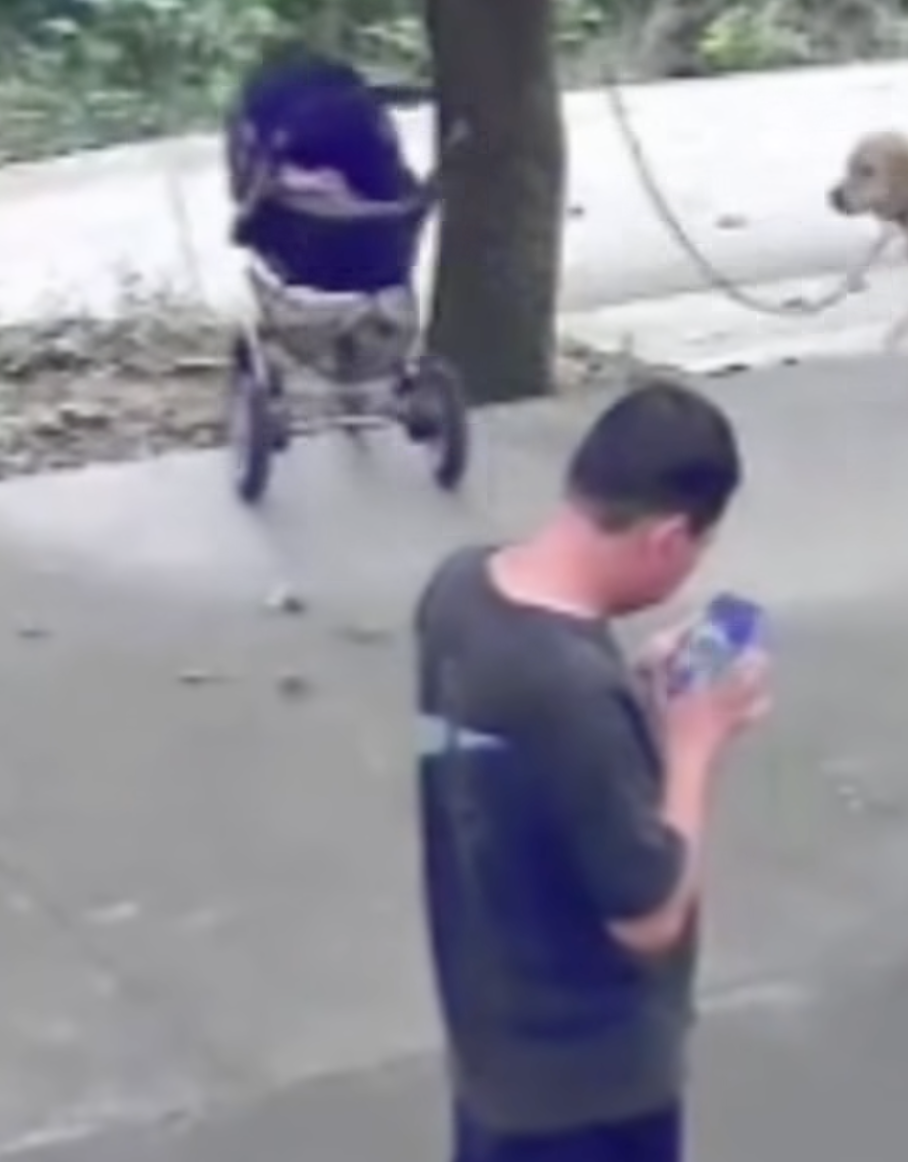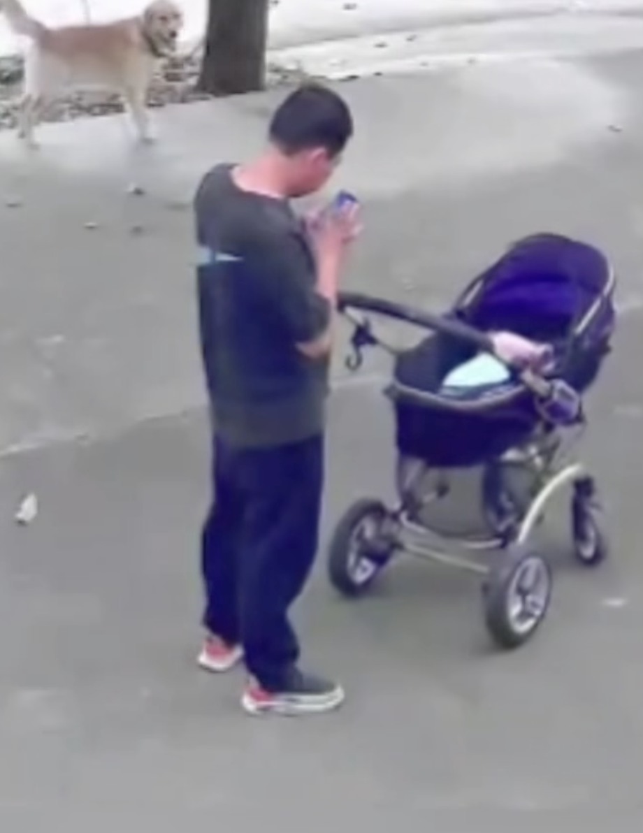 Trong clip, người bố đứng ngay cạnh xe đẩy nhưng mắt dán chặt vào màn hình điện thoại, hoàn toàn không để ý rằng chiếc xe đang từ từ trôi xuống dốc. Ngay cả chú chó Golden đứng cạnh cũng nhận ra điều bất thường, song anh vẫn không phản ứng. Chỉ đến khi xe đẩy lật úp, đứa trẻ bật khóc, ông bố mới giật mình hoảng hốt chạy lại.