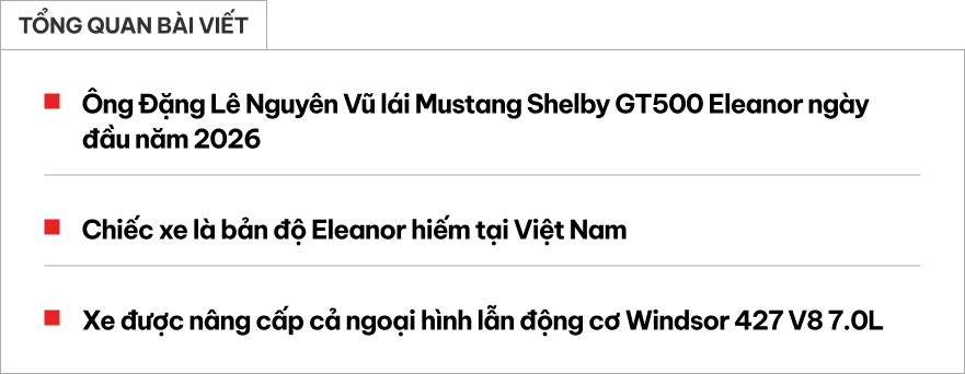 Đầu năm 2026, giới chơi xe trong nước đặc biệt chú ý thông tin ông Đặng Lê Nguyên Vũ trực tiếp cầm lái chiếc Ford Mustang Shelby GT500 phiên bản Eleanor xuất hiện trên đường phố ngay trong ngày đầu năm mới. Hình ảnh doanh nhân nổi tiếng với niềm đam mê xe cổ và xe độc lái mẫu "muscle car" huyền thoại nhanh chóng lan truyền, đưa cái tên Eleanor trở lại tâm điểm sau thời gian dài vắng bóng.