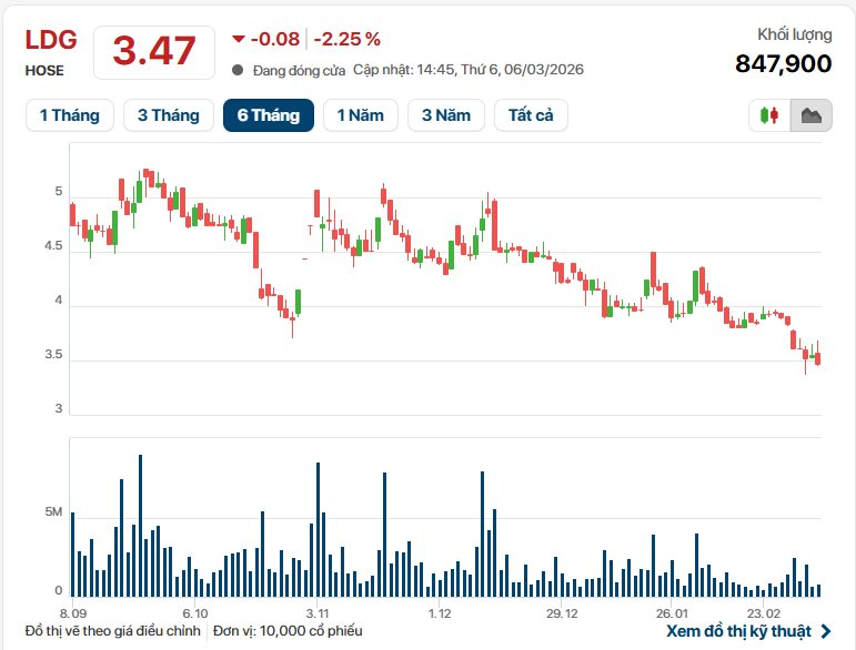 Trên thị trường chứng khoán, kết phiên 06/3, giá cổ phiếu LDG ở mức 3.470 đồng/cổ phiếu, giảm 2,25% so với phiên trước, khối lượng cổ phiếu giao dịch khớp lệnh đạt 847,9 nghìn đơn vị.