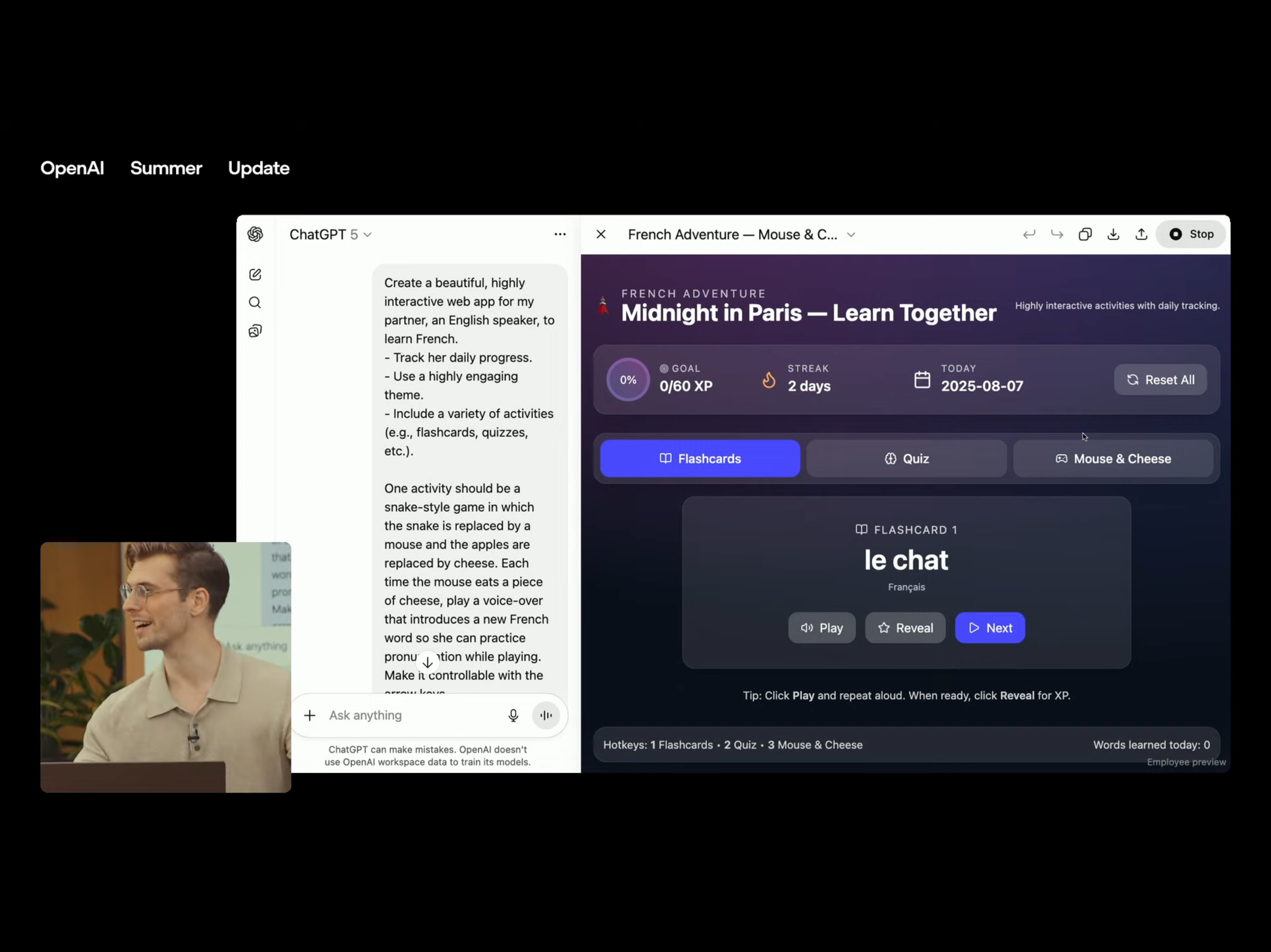 Trong buổi trình diễn, Yann Dubois, trưởng nhóm hậu huấn luyện của OpenAI đã yêu cầu GPT-5 tạo ra một website học tiếng Pháp với trò chơi tương tác. Chỉ sau vài giây, hàng trăm dòng mã được sinh ra, và một giao diện hoàn chỉnh hiện ra trên màn hình. Anh chỉ cần nhấp chuột vài cái là đã có thể dùng thử website học ngôn ngữ tự động do AI dựng lên.