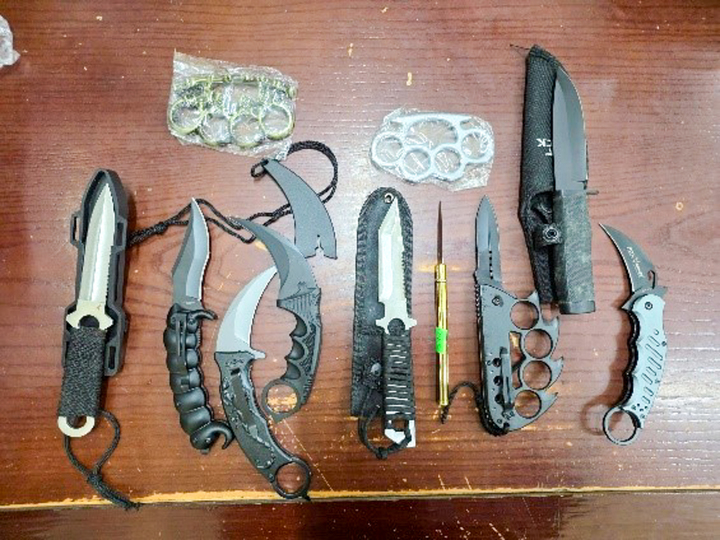 Tang vật thu giữ bao gồm 153 gậy ba khúc, 490 dao kim loại các loại, 14 dao dạng bút, 15 côn nhị khúc bằng kim loại, 141 bình xịt hơi cay, cùng 3 khẩu súng bắn điện và 9 viên đạn chuyên dụng. Ngoài ra, cơ quan công an còn thu giữ 9 dùi cui điện.