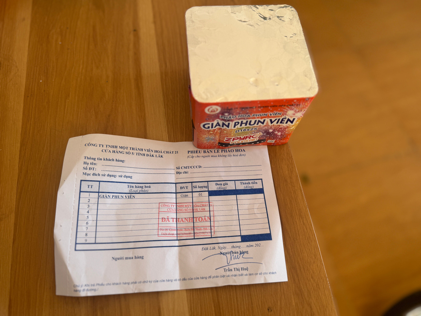Đáng nói, sau khi chi trả 440.000 đồng cho một giàn phun viên, thứ chúng tôi nhận về không phải hóa đơn hợp lệ mà là một mảnh giấy trắng. Tờ giấy không thông tin người mua, không đơn giá, chỉ vỏn vẹn ba chữ "đã thanh toán tiền".