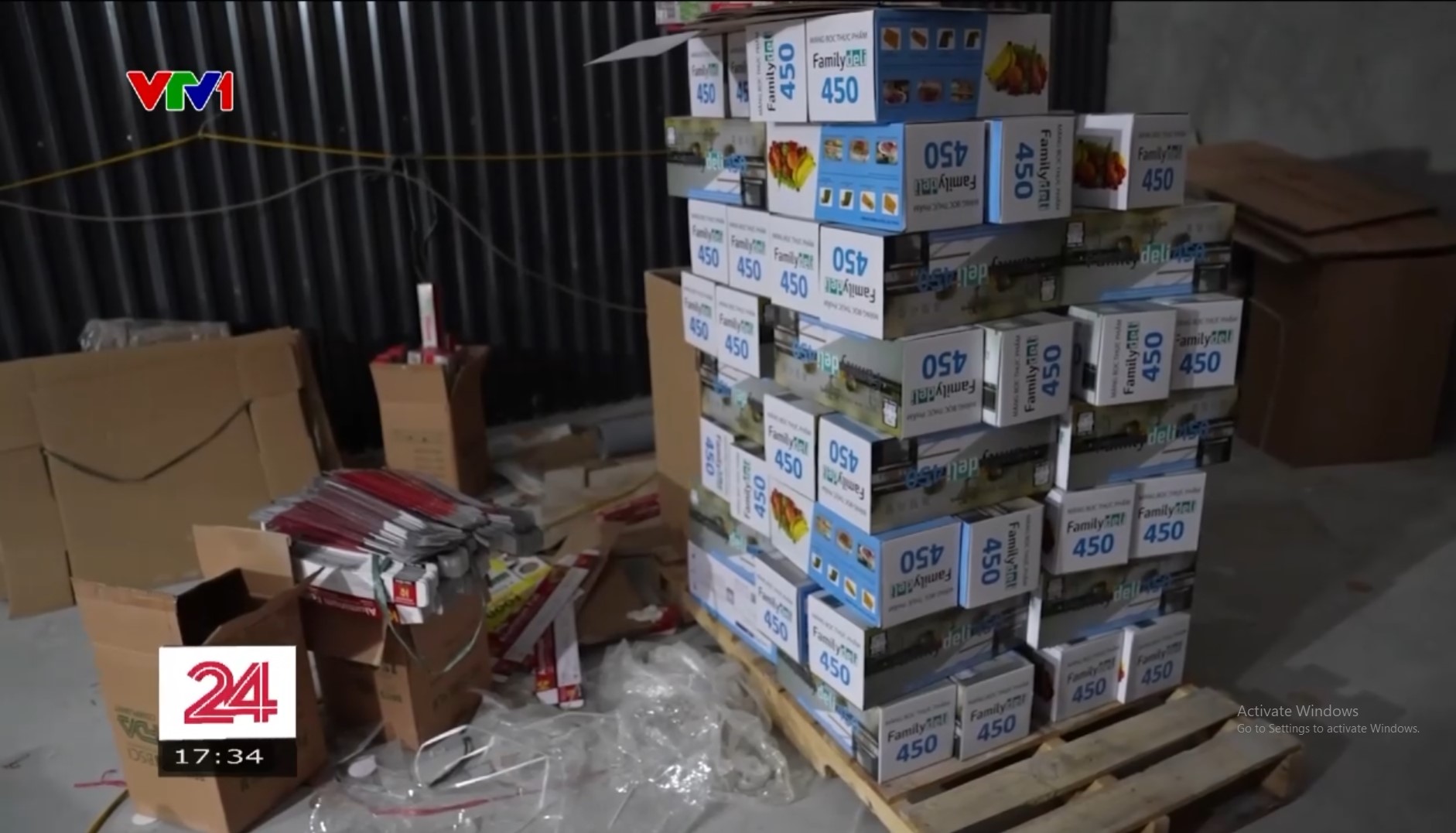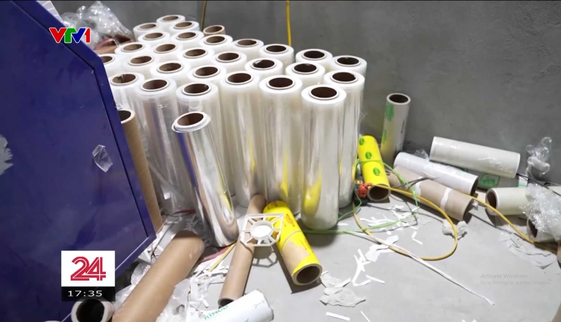 Những lõi màng bọc thực phẩm chất ngổn ngang trong kho xưởng bụi bặm, ẩm thấp. Ảnh: Cắt từ clip