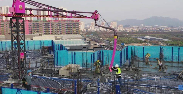 Một thiết bị nổi bật tại đây là máy phân phối bê tông thông minh với thiết kế cao lớn và màu hồng đặc trưng. Thiết bị này chịu trách nhiệm bơm bê tông cho các tầng tiêu chuẩn của toàn bộ dự án.