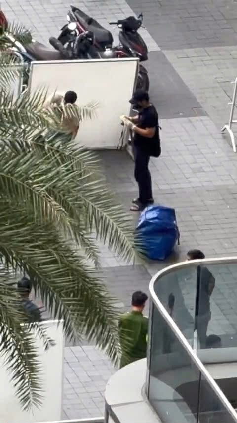 Công an có mặt phong tỏa hiện trường, điều tra. Kiểm tra ban đầu công an phát hiện thi thể một người đàn ông được giấu trong chiếc túi màu xanh ở khu vực tòa nhà. Thi thể này đã tử vong từ trước, đang bắt đầu quá trình phân hủy và có các dấu hiệu bất thường.