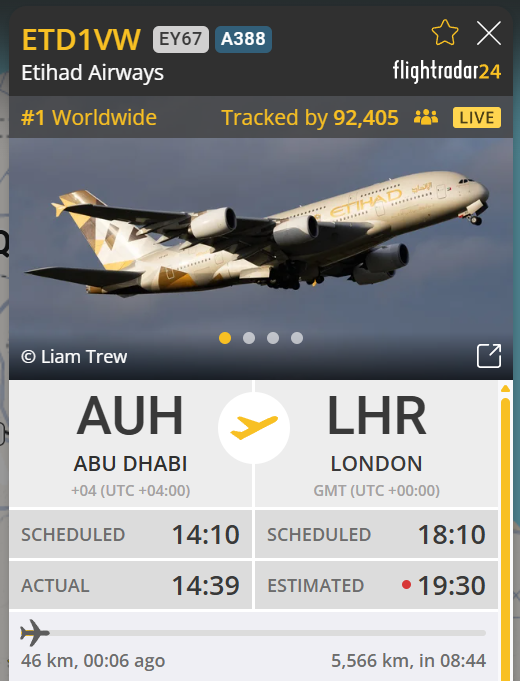 Ngày 2/3, dữ liệu từ Flightradar24 cho thấy một chiếc "siêu máy bay" Airbus 380 của Etihad Airways đã cất cánh từ điểm nóng Abu Dhabi (UAE) đi London (Anh), là chiếc đầu tiên rời khỏi điểm nóng. Ngay sau đó là hàng loạt chuyến bay đến Riyadh, Amsterdam và Islamabad. Chuyến bay từ điểm nóng được cả thế giới nín thở chú ý giữa lúc có thông báo ngừng bay.