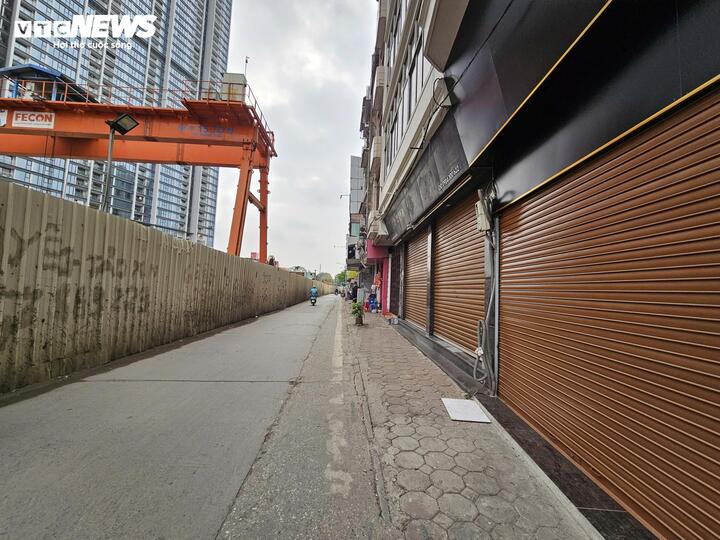 Dãy cửa hàng trên phố Kim Mã đồng loạt đóng cửa, mặt tiền “phố vàng” trở nên im lìm khi công trường metro quây tôn kéo dài.