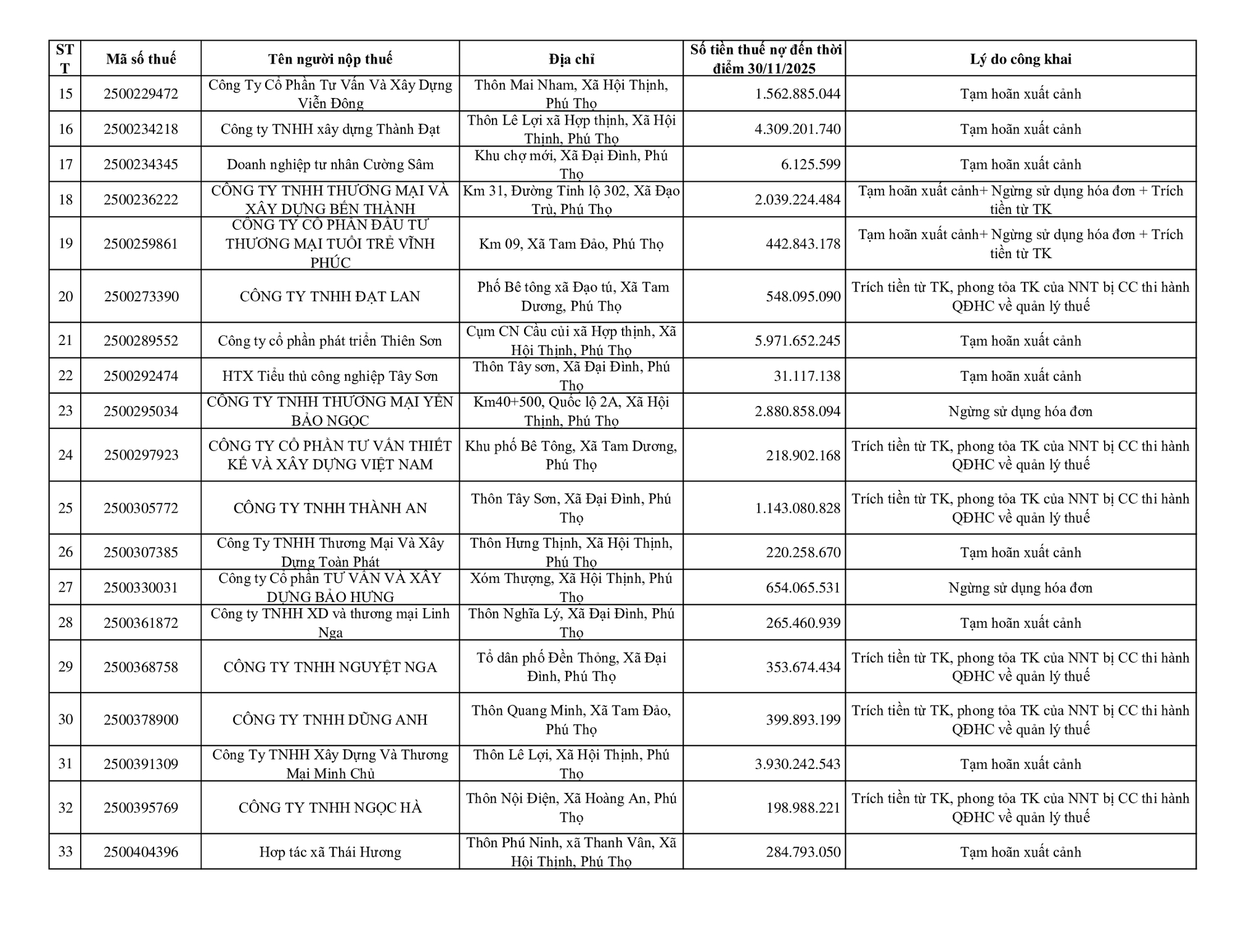 Theo danh sách Thuế Cơ sở 10 Tỉnh Phú Thọ công bố, đơn vị nợ thuế lớn nhất ở địa phương là Công ty Cổ phần Phát triển Thiên Sơn, địa chỉ tại Cụm CN Cầu củi xã Hợp thịnh, Xã Hội Thịnh, Phú Thọ với mức nợ thuế 5,97 tỷ đồng. Cơ quan thuế đang áp dụng biện pháp tạm hoãn xuất cảnh với lãnh đạo công ty này.