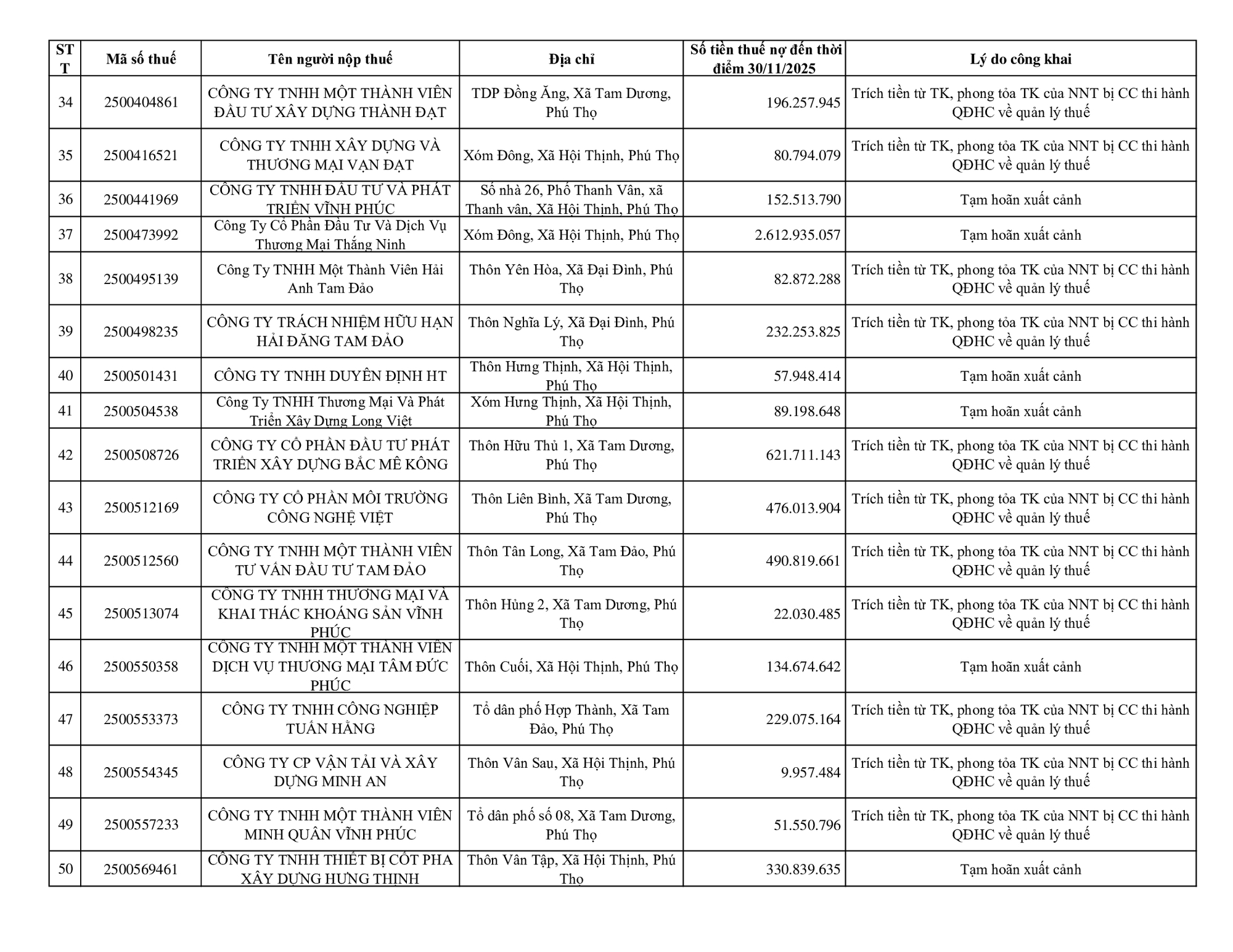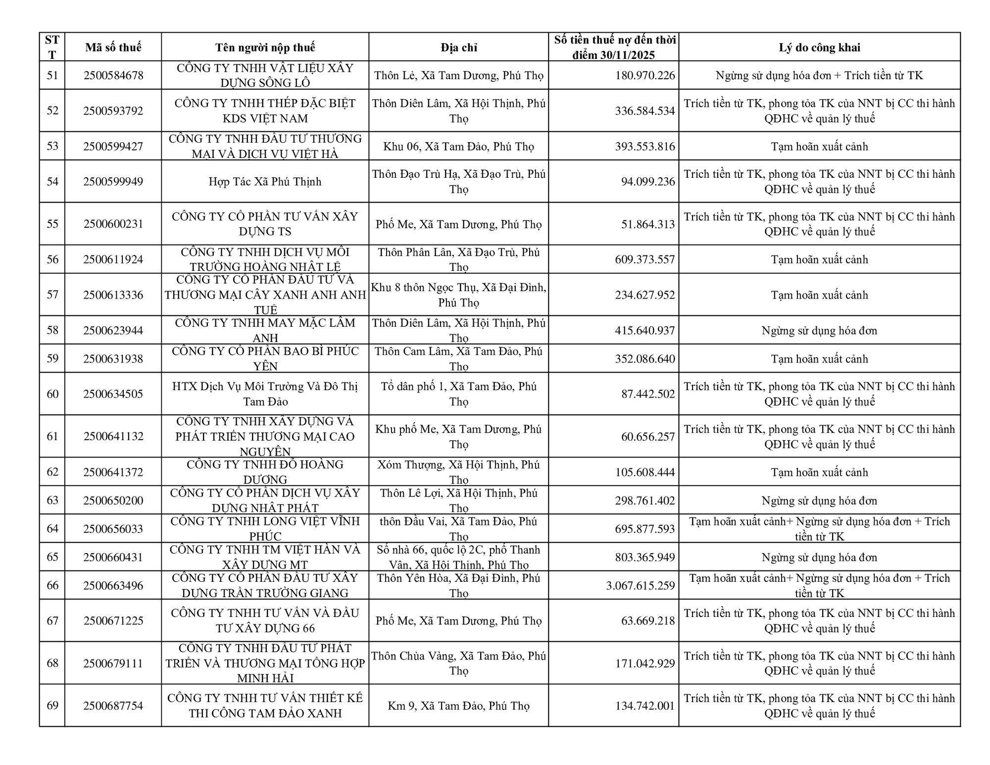 Theo lý do Thuế Cơ sở 10 Tỉnh Phú Thọ công bố, nhiều người nộp thuế không còn hoạt động tại địa chỉ đăng kí, nhiều người chây ỳ nộp thuế dù cơ quan thuế đã ban hành nhiều giấy mời làm việc, thông báo nợ nhưng không nộp… Cơ quan thuế đã ban hành nhiều quyết định tạm hoãn xuất cảnh, ngừng sử dụng hóa đơn và phong tỏa tài khoản, trích tiền từ tài khoản của người nộp thuế bị cưỡng chế thi hành quyết định hành chính về quản lý thuế.