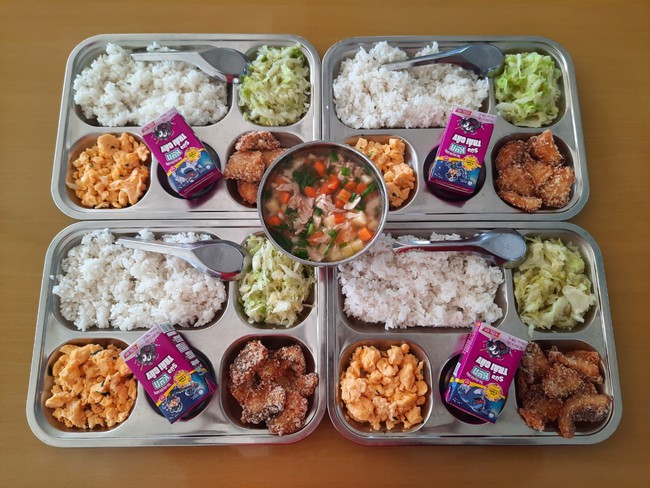 Hình ảnh được phụ huynh chia sẻ cho thấy bữa ăn của con em mình vô cùng đầy đặn: có cơm, thịt, cá, tôm, rau xanh, thêm cả canh và trái cây tráng miệng.