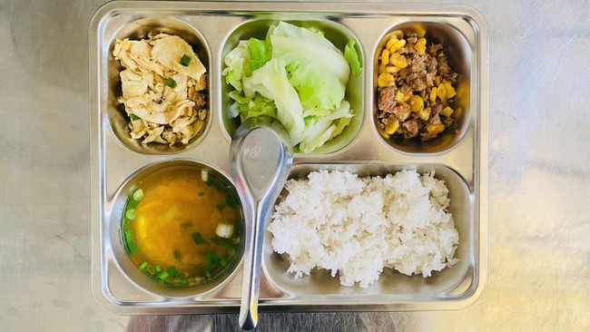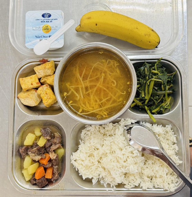 Tuy nhiên, cũng không ít phụ huynh Hà Nội đăng hình ảnh và cho rằng bữa ăn ở trường con mình chưa được phong phú như ở các nơi khác. Có người chia sẻ suất ăn của con chỉ có cơm với một món mặn, thêm chút canh, trông khá đơn giản so với những tấm hình "đẹp như mơ" được chia sẻ trên diễn đàn.
