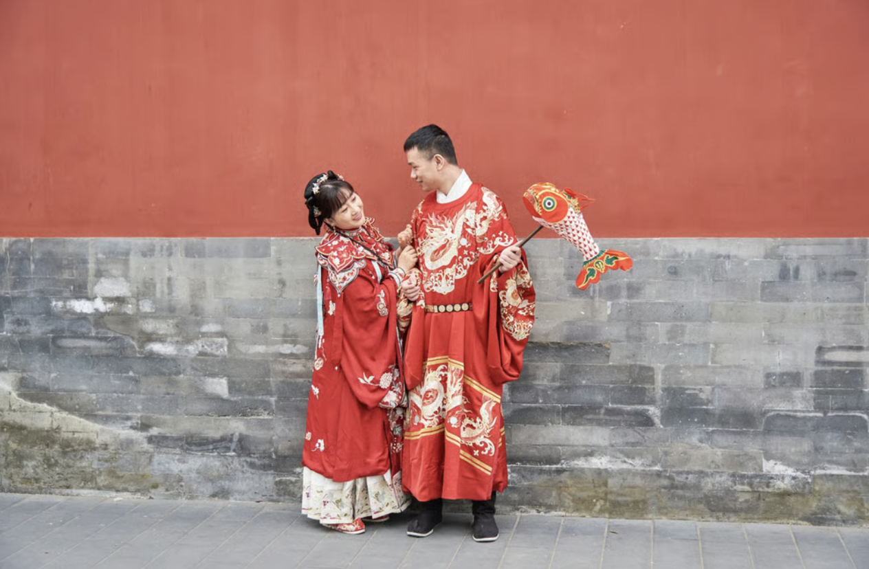 Một cặp đôi chụp ảnh kỷ niệm trong lễ cưới của họ. Tỷ lệ kết hôn ở Trung Quốc đã giảm đáng kể trong những năm gần đây.