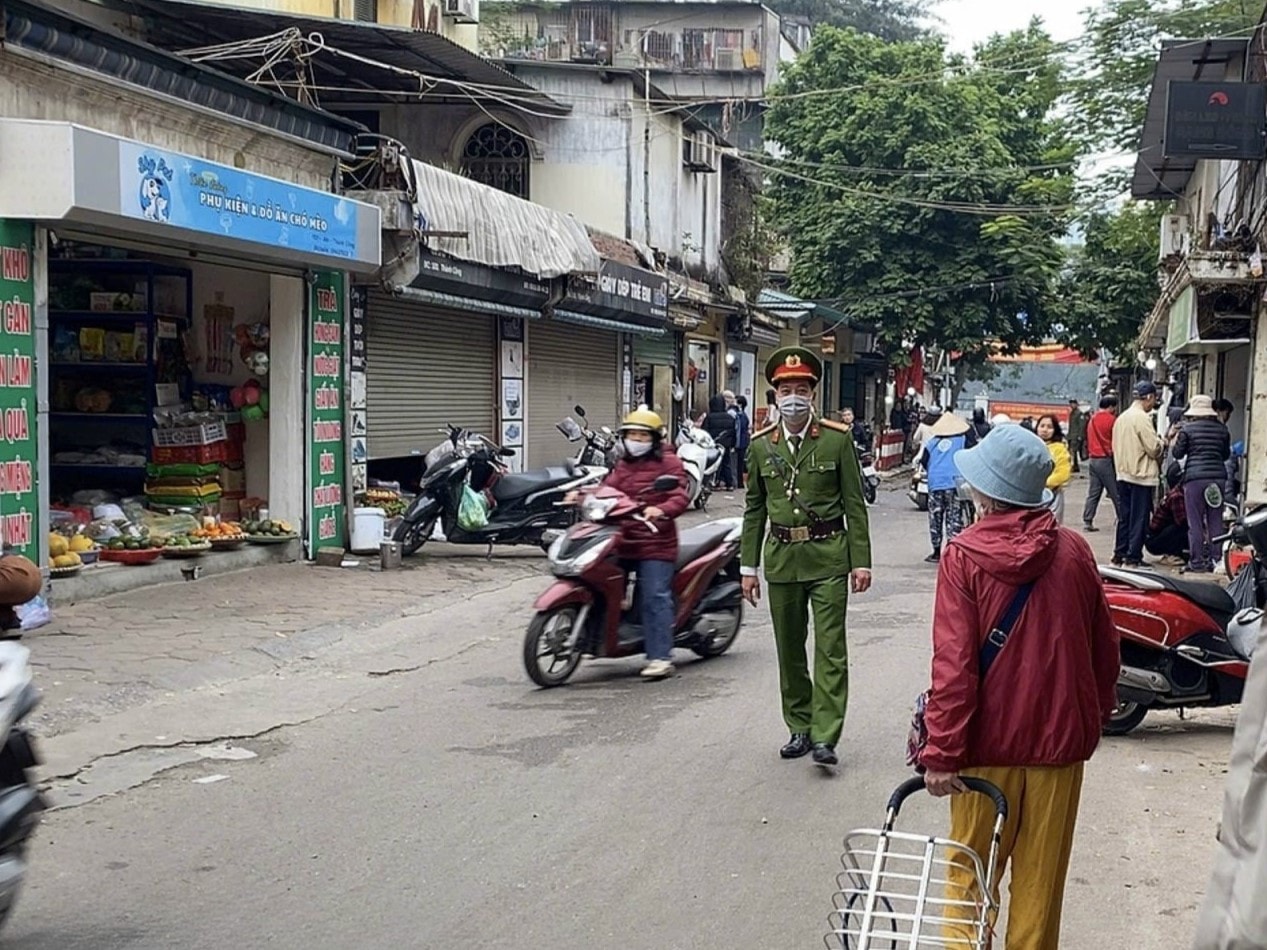 Công an phường Giảng Võ duy trì tuần tra sau sắp xếp tại trục đường nội bộ E1-A6A và A1-A2 phố Thành Công. Ảnh: NH