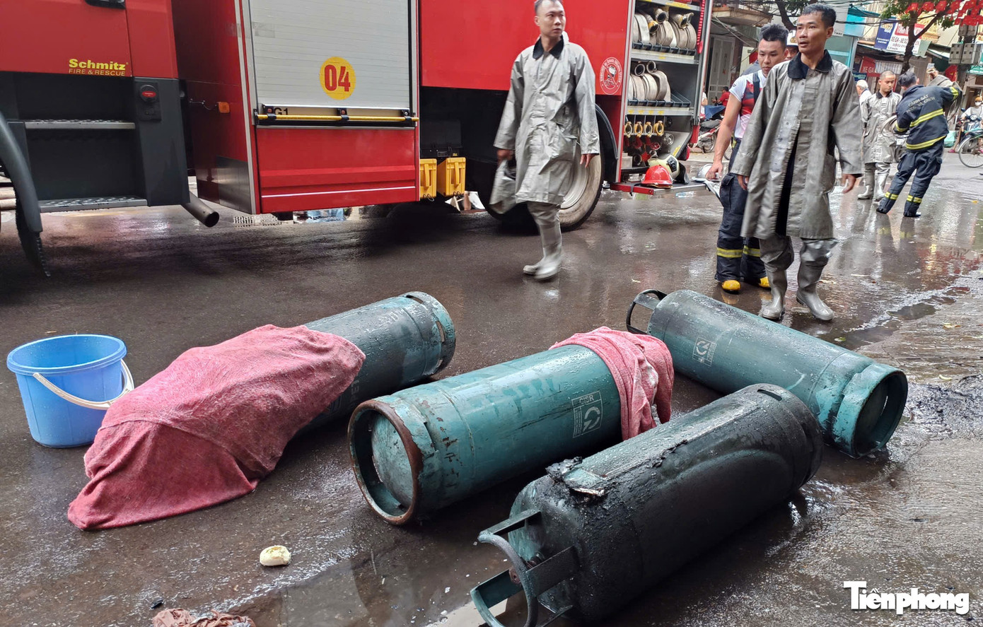 Ngôi nhà kế bên cửa hàng cơm cũng bị ảnh hưởng sau vụ cháy. 4 bình ga cỡ lớn được lực lượng chữa cháy đưa ra ngoài và bị rò rỉ ga phải quấn chăn ướt.
