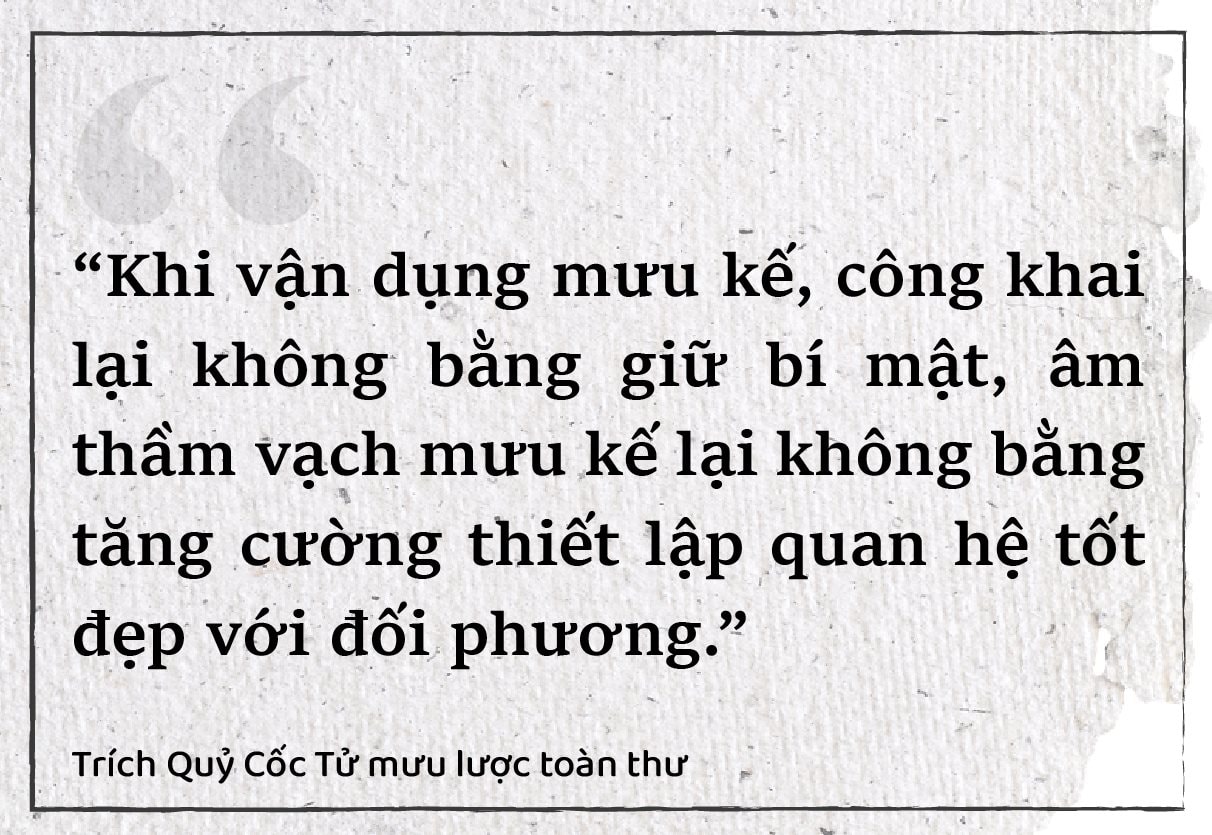 Thánh nhân thường giữ kín mưu lược, còn kẻ thiếu tinh tế lại hay phô trương. Người biết kìm nén cảm xúc, không bộc lộ yêu ghét mới có thể được giao việc lớn. Việc đã mất khó khôi phục, nguy nan khó đổi thành an toàn, chỉ có âm thầm vận dụng mưu lược mới tránh được rủi ro. “ Phép tắc đối nhân xử thế của thánh nhân cũng tinh tế ở chỗ giấu kín ”, không dựa vào hình thức đạo đức bề ngoài, mà dựa trên sự phù hợp với quy luật vận động và tính thực tiễn. Quan điểm này của Quỷ Cốc Tử có sự tương đồng với tư tưởng của nhà chính trị Niccolò Machiavelli (1469–1527) – tác giả của kiệt tác Quân Vương – Thuật cai trị , một trong những đầu sách quý thuộc Tủ sách Nền Tảng Đổi Đời . Cả hai ông đều nhấn mạnh rằng để giành thắng lợi – trên chiến trường hay thương trường – cần mưu trí, chuẩn bị kỹ lưỡng, biết che giấu và vận dụng linh hoạt nguyên tắc đúng thời điểm.