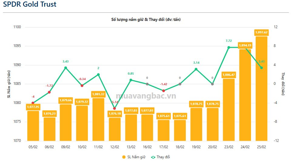 Cập nhật mới nhất, quỹ vàng lớn nhất thế giới SPDR Gold Trust đã mua ròng 3,4 tấn vàng trong phiên 25/2, nâng khối lượng nắm giữ lên 1.097,6 tấn. Như vậy, quỹ đã mua ròng tổng cộng gần 19 tấn vàng trong 3 phiên liên tiếp.