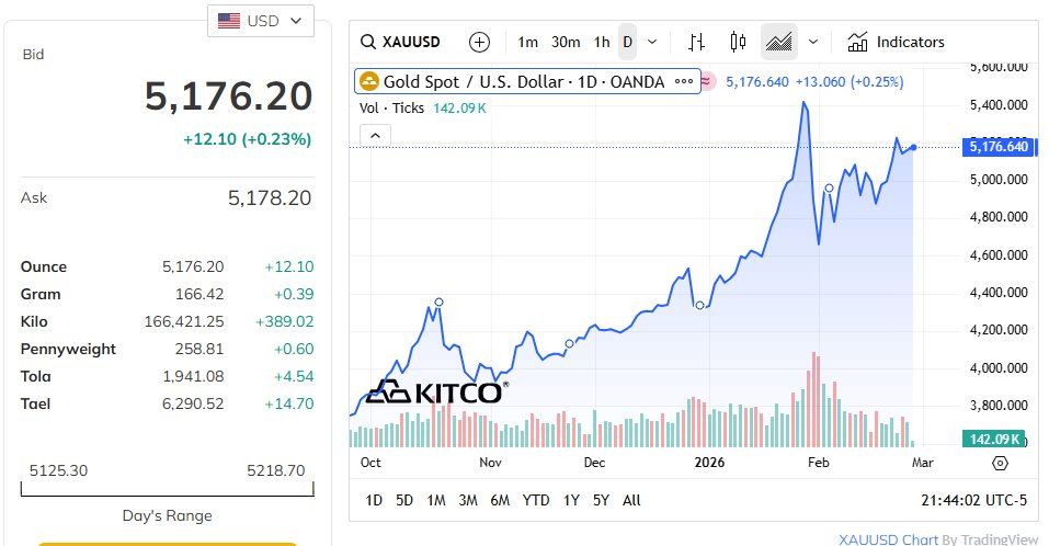 Việc quỹ vàng lớn nhất thế giới gia tăng nắm giữ diễn ra trong bối cảnh giá vàng cho thấy dấu hiệu hồi phục. Theo dữ liệu từ sàn Kitco, giá vàng giao ngay đóng cửa phiên 25/2 tại mốc 5.164 USD/oz, tăng 0,38% so với phiên trước, thậm chí trong phiên, có lúc giá vàng giao ngay đạt gần 5.220 USD/oz.