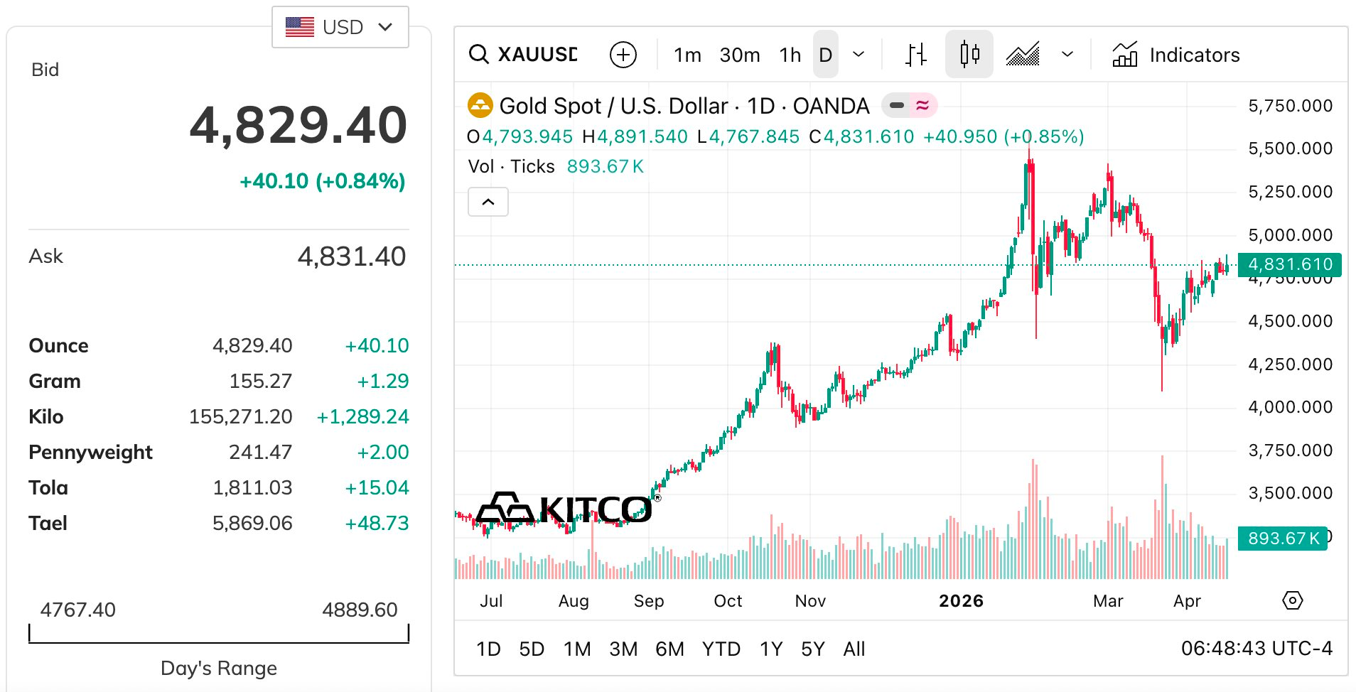 Theo dữ liệu từ sàn Kitco, giá vàng thế giới tiếp đà phục hồi và chinh phục nhiều mốc tâm lý quan trọng, hiện giao dịch quanh vùng 4.800 USD/ounce (phiên 18/4). Tính trong tuần vừa qua, giá vàng đã bật tăng 1,7%. Xa hơn, kể từ đáy 4.400 USD/oz phiên 23/3, giá vàng đã bật tăng 9% chỉ sau chưa đầy 1 tháng.
