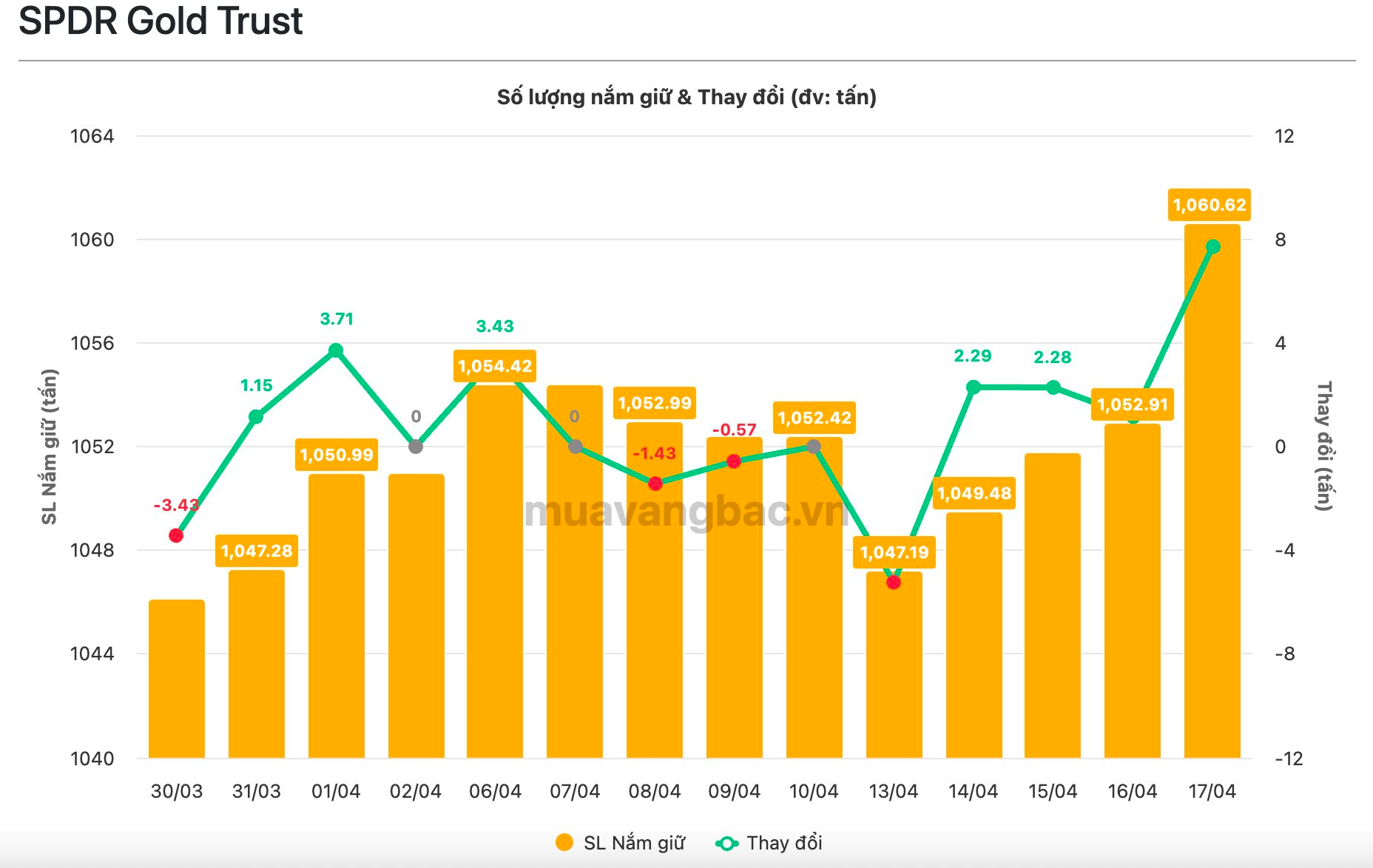 Theo cập nhật từ Muavangbac.vn, quỹ vàng lớn nhất thế giới SPDR Gold Trust đã mua ròng hơn 7,7 tấn vàng trong ngày 17/4, nâng tổng lượng nắm giữ lên trên 1.060 tấn. Đây là phiên thứ 4 liên tiếp tổ chức này gia tăng tích trữ với lượng mua ròng lên tới 13,4 tấn.