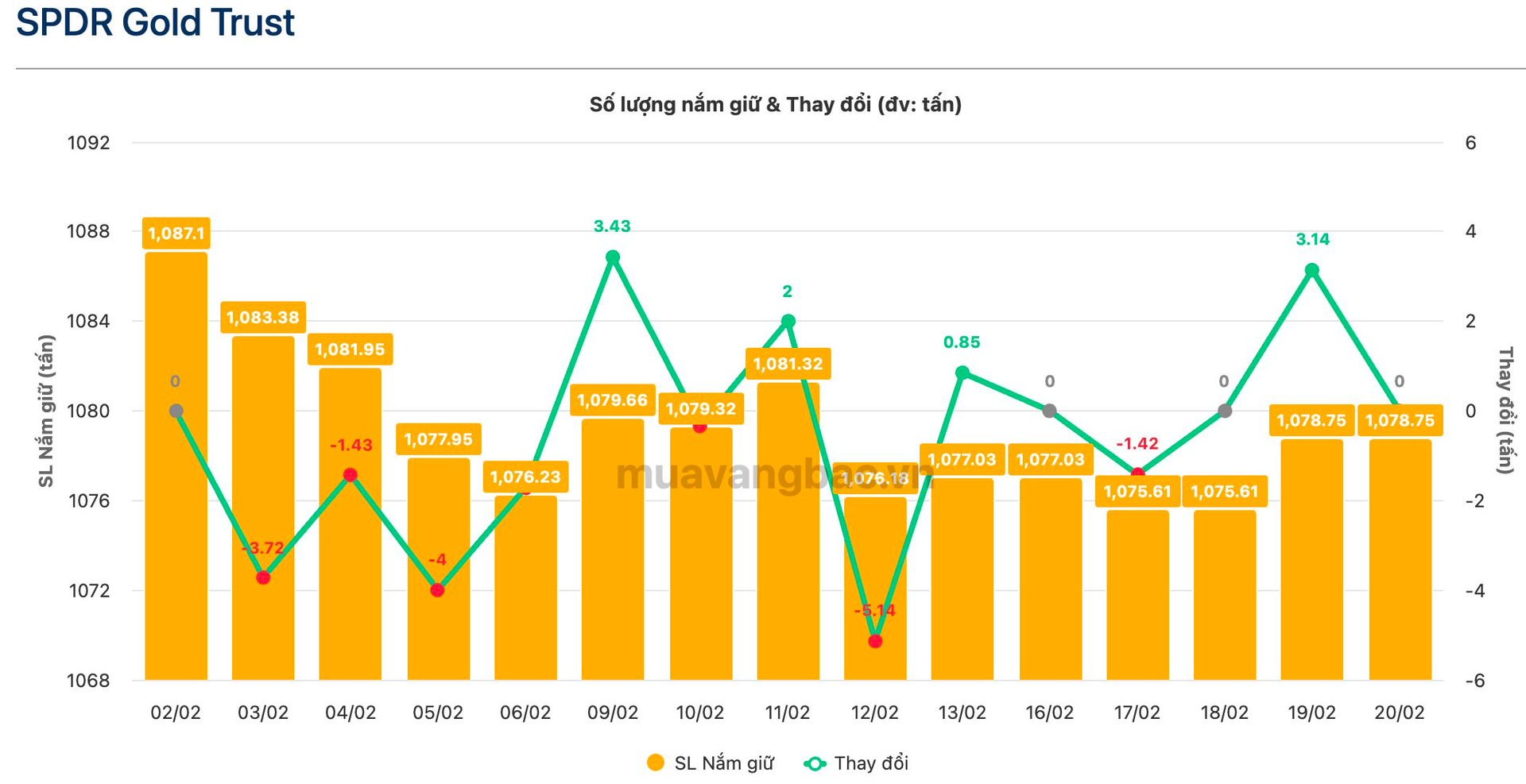 Theo dữ liệu thống kê mới nhất từ Muavangbac.vn, quỹ vàng lớn nhất thế giới SPDR Gold Trust không giao dịch trong phiên 20/2, khối lượng vàng nắm giữ vẫn giữ nguyên ở mức 1.078,8 tấn vàng. Trước đó, SPDR đã “gom” hơn 3,1 tấn vàng (55 triệu USD) ngày 19/2.