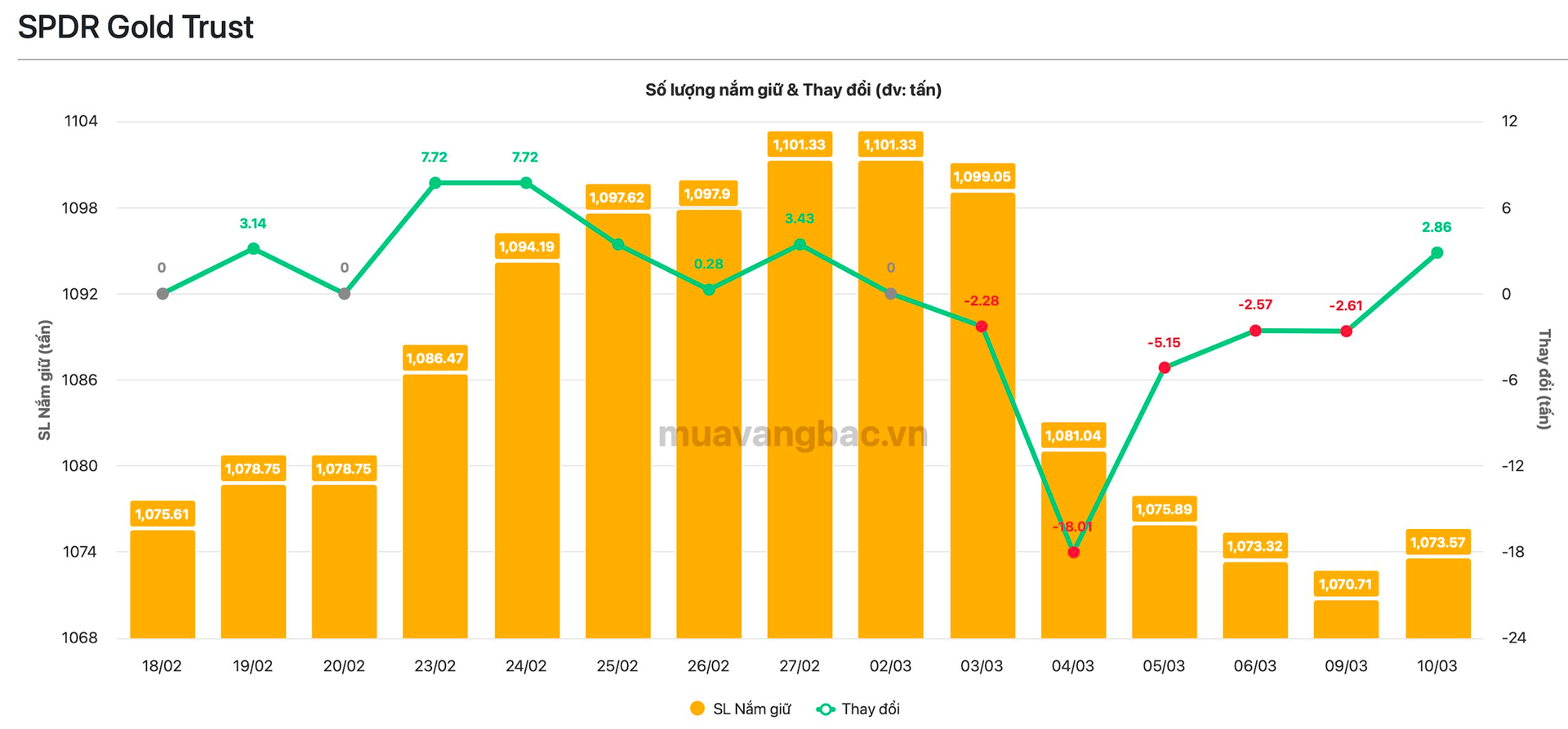 Theo dữ liệu cập nhật từ Muavangbac.vn, quỹ vàng lớn nhất thế giới SPDR Gold Trust đã mua vào 2,86 tấn vàng trong ngày 10/3, qua đó chấm dứt chuỗi ngày bán ra liên tiếp. Trong 5 ngày trước đó, quỹ đã bán ra tổng cộng 31 tấn vàng. Tính đến ngày 10/3, SPDR đang nắm gần 1.074 tấn vàng, tương ứng giá trị khoảng 180 tỷ USD.