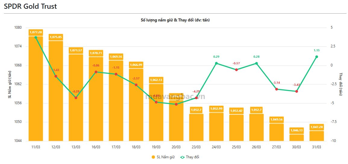 Theo cập nhật từ Muavangbac.vn, quỹ vàng lớn nhất thế giới SPDR Gold Trust trở lại mua ròng nhẹ 1,15 tấn vàng trong ngày cuối tháng 3. Hiện tại, SPDR nắm hơn 1.047 tấn vàng.
